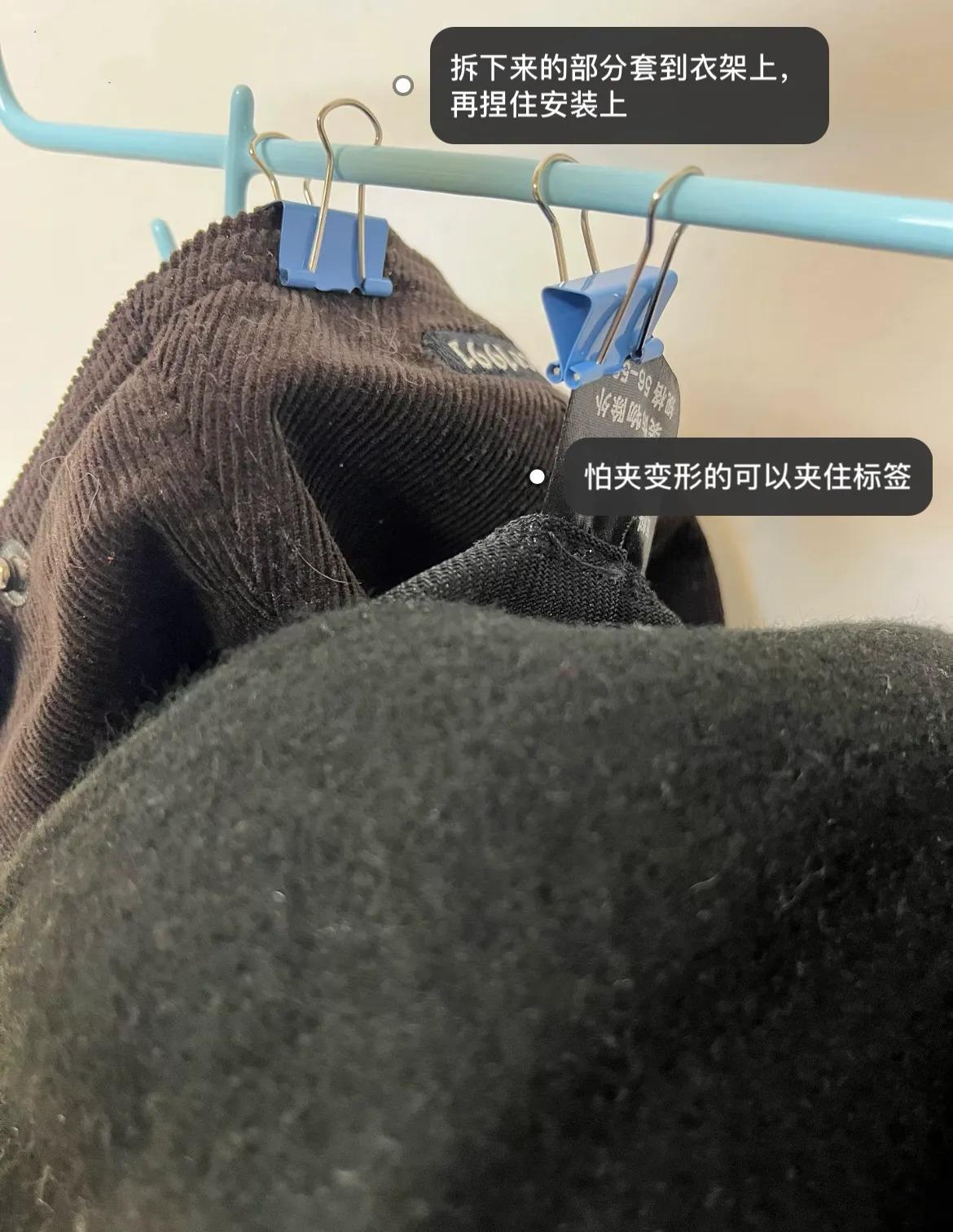 拆開燕尾夾的尾巴,套在衣架上,相比上一個的好處是,除了集中,還不挑帽子款式。