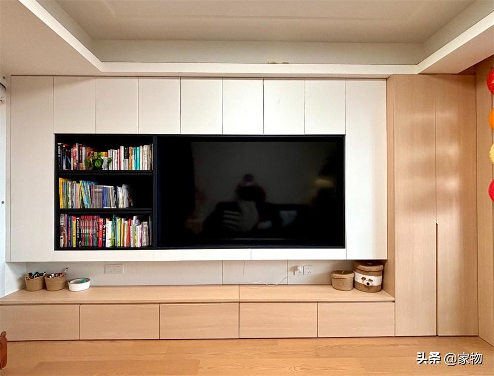家裏的客廳開間還算不錯,乾脆就做成了同樣白色和木色經典搭配的滿牆電視櫃。