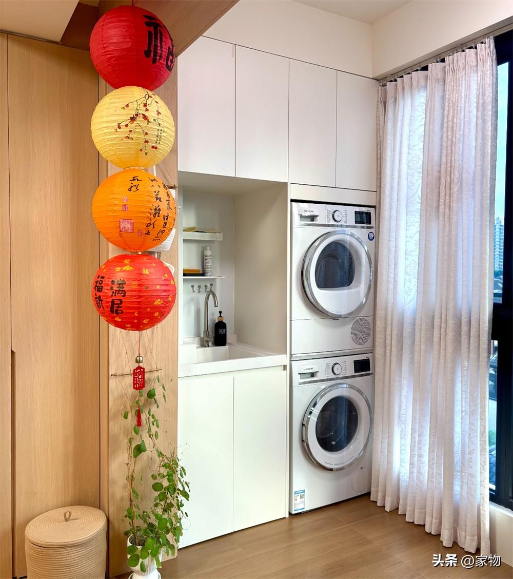 反而做成櫃子,將埡口的深度填滿,對我來說就是個收納洗衣粉洗衣液和貓糧貓砂的絕佳區域,即便是再放下洗衣機烘乾機組合,也顯得很整潔。