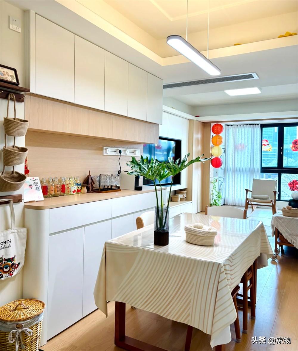 但你別說,白色和木色相互搭配,不僅很適合家裏偏原木的現代風格,更是能收納下更多的杯盞碗碟,留出檯面一處水吧,也絲毫不會覺得亂。