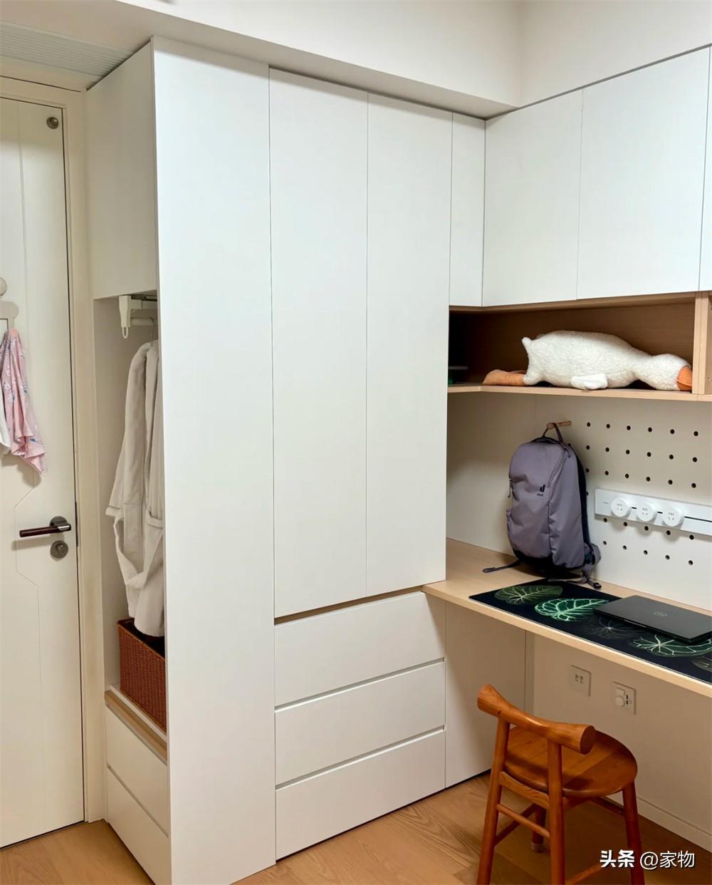 除了基本的衣櫃收納區以外,側邊還做了個次淨衣區,底部放上髒衣簍,第二天要穿的內襯內搭或者要洗的衣物,都能隨手放在這處位置,不至於丟得家裏沙發飄窗到處都是。