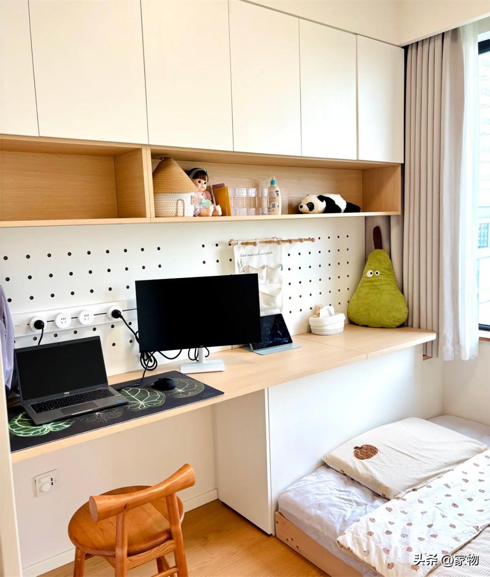 爲了讓書房靈活一些,這裏大體採用了兒童房相似的佈局,但卻沒有做地臺牀,而是用一個牀板進行替代。