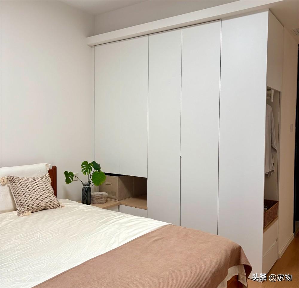 主臥室做的這組大衣櫃,直接連接牀頭櫃進行佈置,側邊掏空了一個櫃格,不影響櫃面置物空間,同時也能讓牀邊有足夠的過道寬度,不影響櫃門開合。