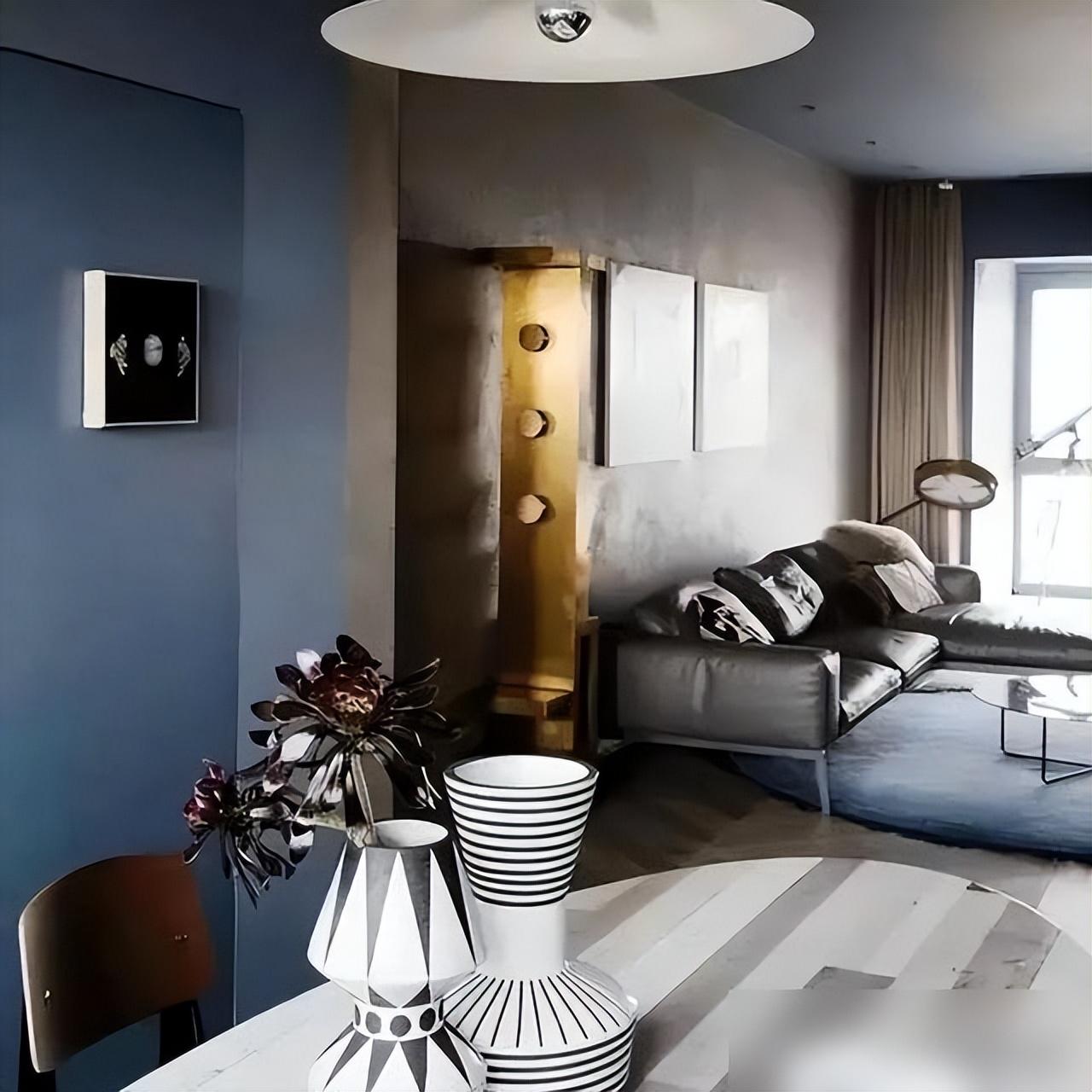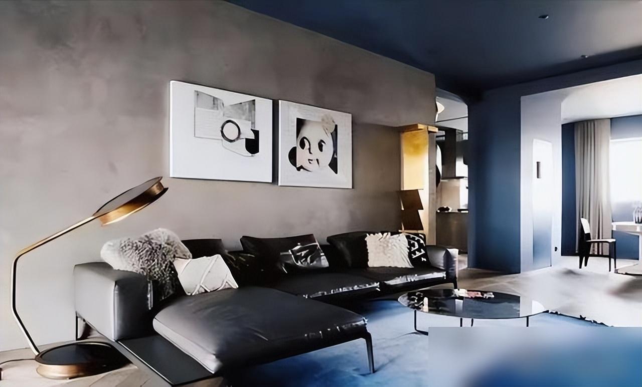 牆面是微水泥做的,不是那種粗糲的水泥毛坯,摸起來細滑得像磨過的鵝卵石,顏色是淺灰調,自帶一種“冷淡的質感”。客廳擺了個黑得發亮的皮質沙發,地上鋪了塊灰藍色的地毯,牆面上掛兩幅白框畫——就這幾樣東西,居然把“低調奢華”四個字演活了,沒有多餘的裝飾,卻連角落都透着“我很講究但我不說”的勁兒。