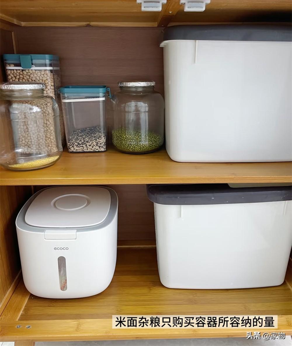 哦對,包括大米在內的各種糧食,也是都放在了米桶、罐頭瓶、收納盒裏,且只准備不超過收納容器的量,一般情況下一兩個月補充一次就行,避免讓櫃內放得東西太多而導致拿取不便。