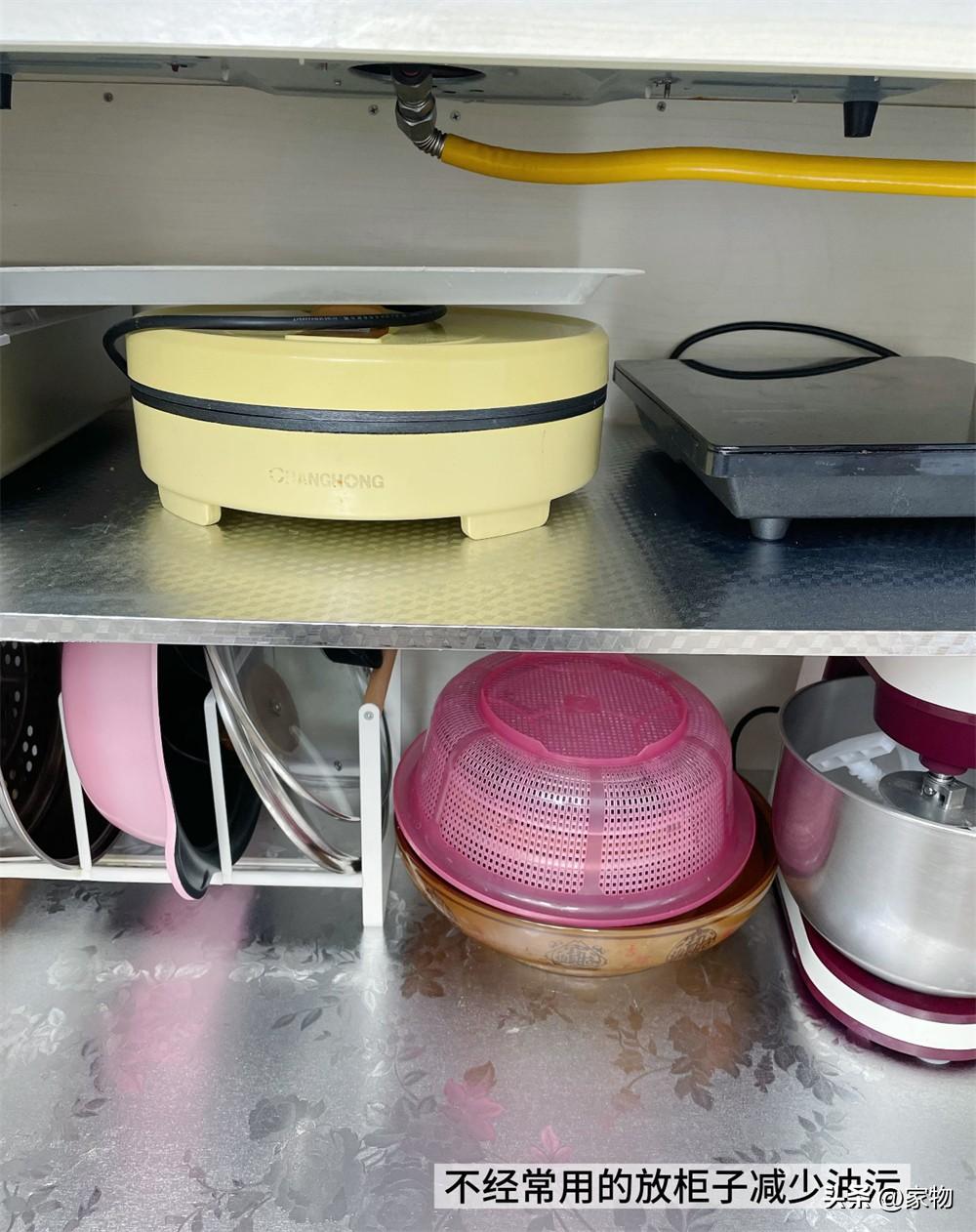 像是餅鐺、電磁爐這類不常用的餐具,也都放在了竈臺下方的底櫃裏,留有縫隙方便拿取,用的時候不用再翻找。