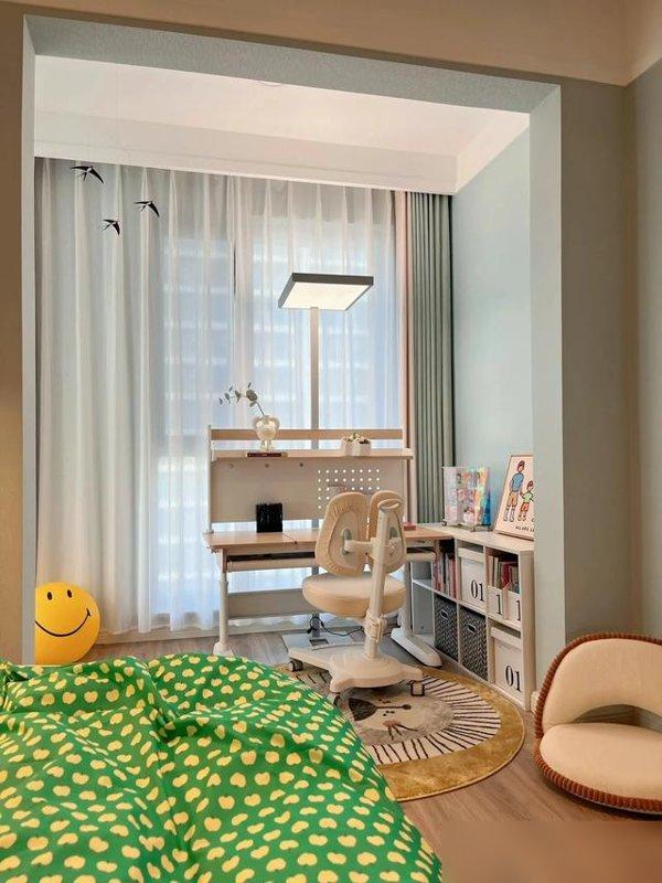兒童房的設計也太懂家長了——不做卡通背景牆(省得孩子三歲就嫌幼稚),全屋貼霧藍壁布,地面鋪木地板,光腳跑都不涼;1.2米單人牀貼牆放,過道變寬能玩玩具;陽臺改學習區,升降書桌用到高中,鬥櫃收納書和衣服,地臺擺繪本——這哪是裝修兒童房,簡直是“給孩子留了成長空間”!現在很多家長裝修兒童房,眼睛盯着“可愛”,結果孩子剛上小學就嫌“幼稚”,得拆了重裝,何必呢?