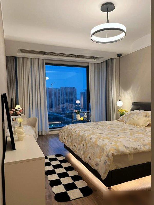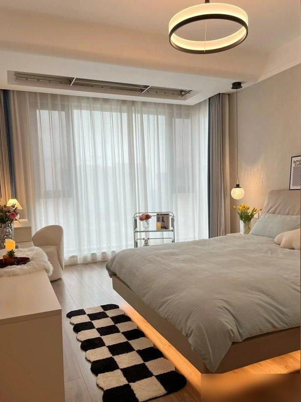 還有陽臺那步操作,真的“封神”了——把陽臺兩側非承重牆打掉,併入臥室!很多人陽臺堆洗衣機、放雜物,活生生把“採光C位”變成“儲物間”,可人家打通後,臥室直接多了塊“陽光區”,尤其是傍晚,落地窗透進來的光裹着香檳豆青壁布,那氛圍感,比去網紅店打卡還舒服!你說,咱花大價錢買房子,難道是爲了給陽臺“囤破爛”嗎?