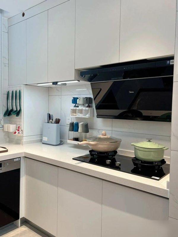 還有嵌入式廚電、洞洞板掛鍋鏟、收納盒放姜蒜——檯面連個調料瓶都沒有,看着就清爽,難道我們做飯是爲了跟調料瓶“搶地盤”嗎?