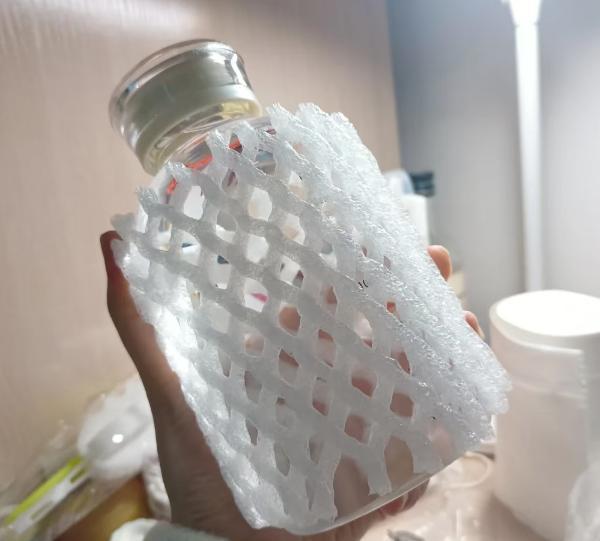 這玩意因爲是無數個獨立的閉孔氣泡組成的,所以很輕、韌性好,還有彈性!運輸水果的時候,難免會碰撞,這網套恰好可以“減震”~