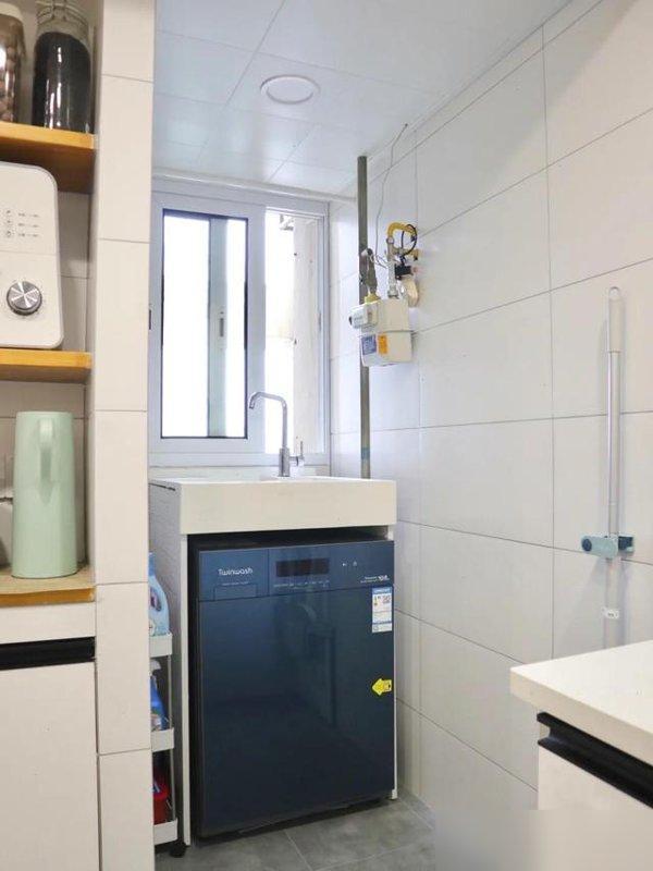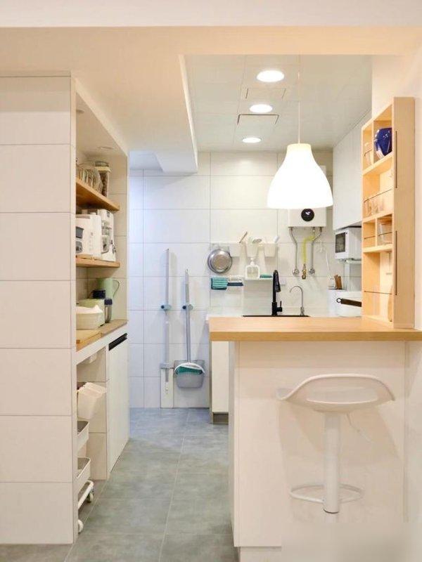 吧檯側面還能儲物,鍋鏟、圍裙塞進去,檯面乾乾淨淨的,看着就舒服。