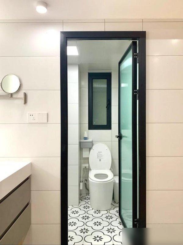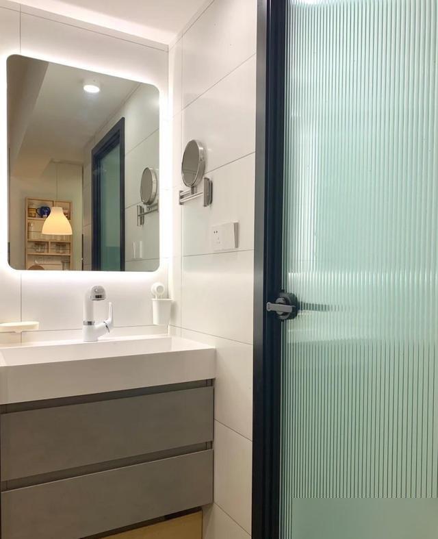 衛生間的設計簡直是“細節控狂喜”!把洗漱臺挪到外面,跟廁所分開,早上家人不用搶着刷牙——媽媽在外面洗臉,爸爸在裏面上廁所,互不干擾。洗手檯下面懸空,剛好塞個髒衣籃,不用再把髒衣服扔在地上堆成山。浴室鏡周圍繞了圈軟燈帶,擠牙膏的時候光打在臉上,比衛生間的白熾燈溫柔多了,好像連洗臉都變成了“儀式感”。