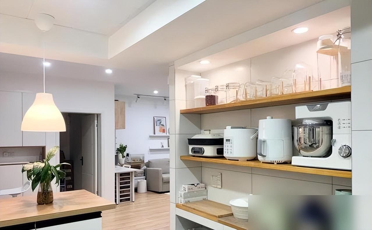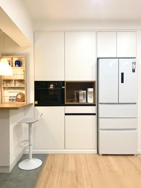 廚房的冰箱櫃藏了大玄機——裏面嵌了冰箱和烤箱,外面看像個普通櫃子,打開全是“做飯的武器”。開放格放着咖啡機和飲水機,做飯的時候順手衝杯咖啡,油煙再大,聞着咖啡香都覺得“值了”。