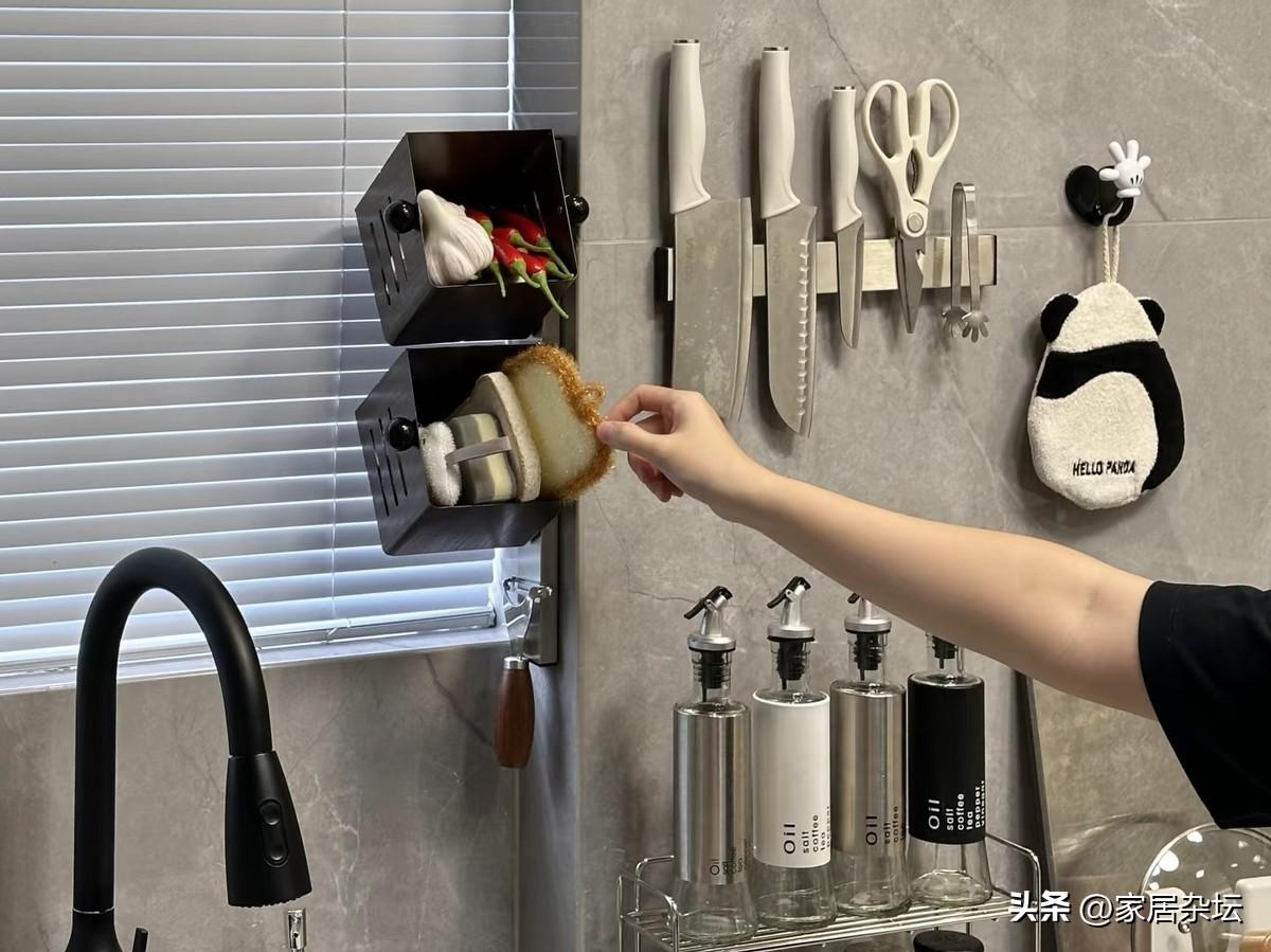 磁吸收納,可以讓我們的廚房檯面得到解放,讓操作檯面更整潔,顯得更寬敞。最爲重要的是,由於是垂直懸掛,可以加速水分蒸發,避免滋生了細菌。