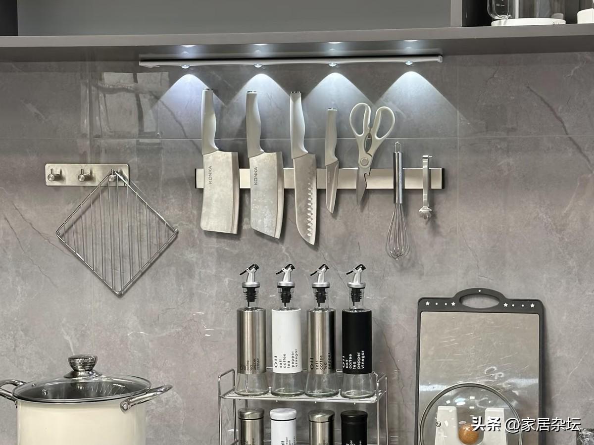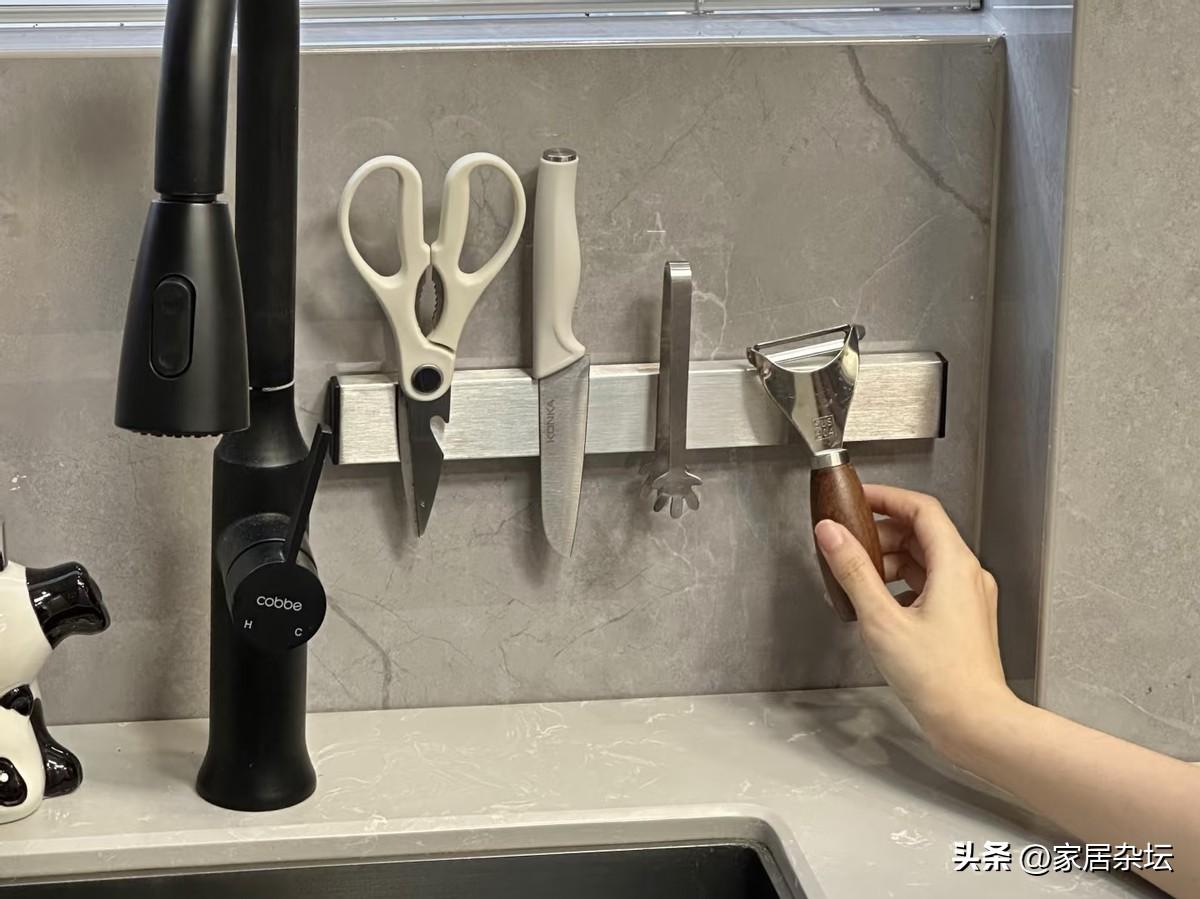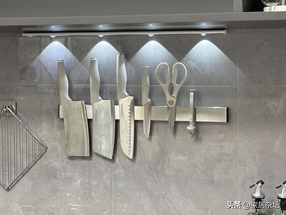 而磁吸刀具收納,是在廚房牆面安裝強磁性的不鏽鋼板,厚度一般2~3毫米。僅僅是這一塊磁吸板,就可以將廚房所有的金屬刀具上牆收納,整齊且一目瞭然。