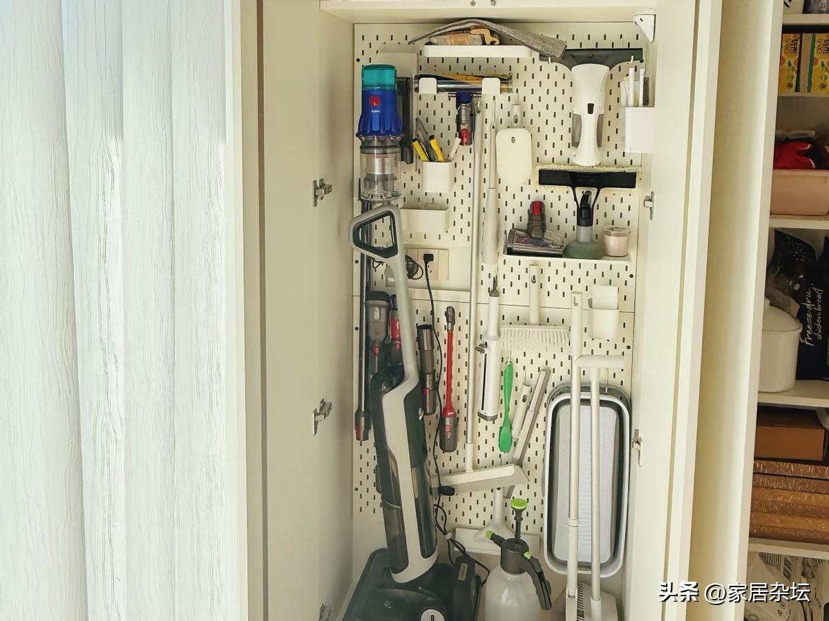 只需要在陽臺的一面牆上,例如側牆定製通頂家政櫃。內部一般可以配置洞洞板,掛鉤,部分層板。就是這一個小小的櫃子,幾乎可以將家裏的清潔工具收納殆盡。