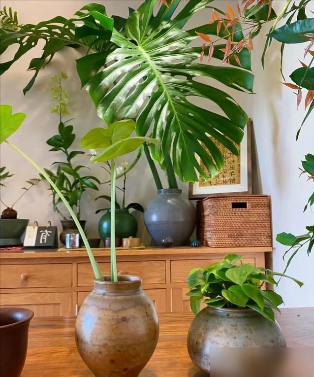 餐邊櫃上的龜背竹是“鎮場選手”,葉子裂得像大扇子,蒼白色葉跡像畫上去的,四季常綠。好多人養龜背竹養死,其實就倆祕訣:別曬強光,土幹了再澆水——就這麼簡單,它能從“小幼苗”長成“大巨人”,就算冬天沒花,也能撐得起整個空間的生機,比買裝飾畫有溫度多了。