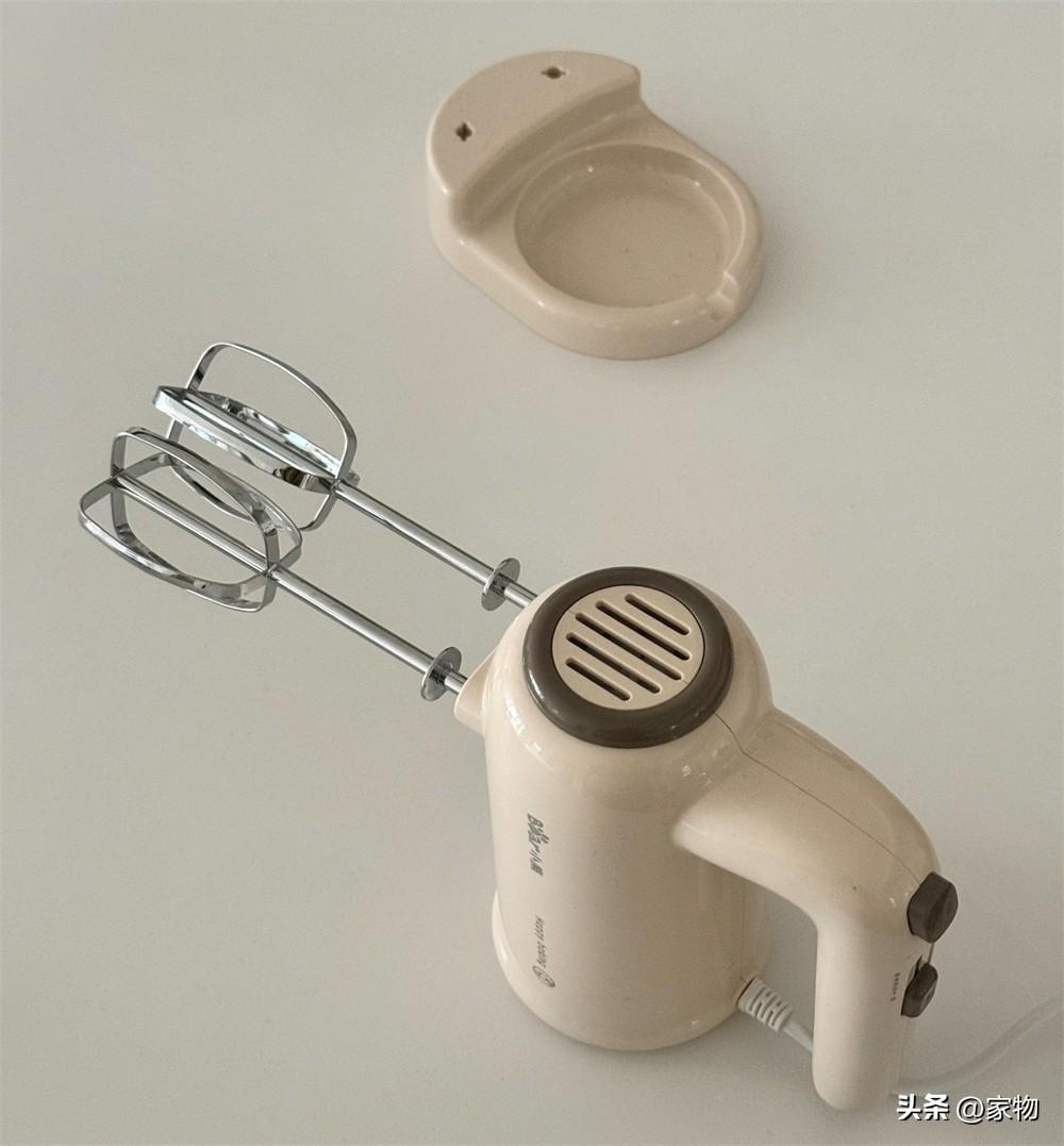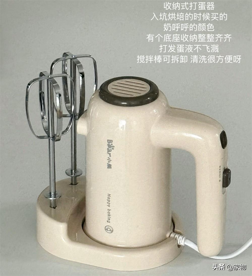 而這種打蛋器就要好用多了,首先,它本身是奶呼呼的溫潤顏色,看起來很可愛,其次,它有一個收納底座,方便收納打蛋頭和手柄機器。