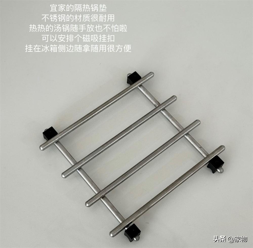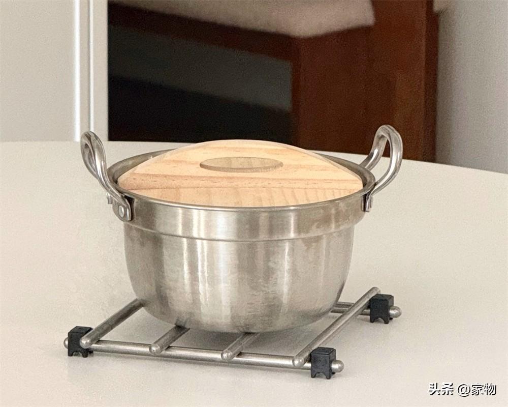 這隔熱鍋墊用起來真的特別踏實,比起之前碎木屑和藤編的鍋墊更加穩定,熱鍋放在上面不易晃動,而這底部兩根不鏽鋼骨架搭上四根不鏽鋼骨架的外觀,也真的是又簡潔又好看,深得我心。