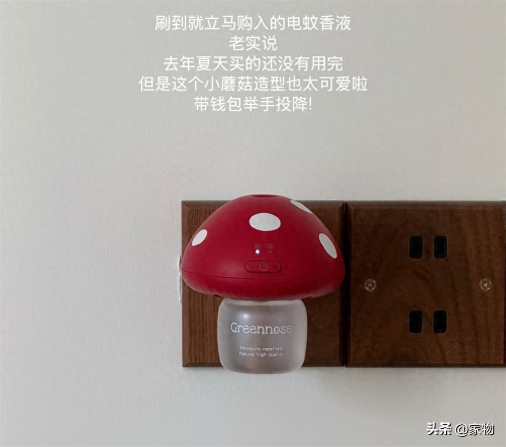 很多電蚊香液其實也就是圖個功能性,壓根沒想到它插在插座上以後到底好不好看,但我之前從拼夕夕買的這個電蚊香液,卻做成了紅底白色圓點的小蘑菇的造型,往插座上一插,顯得可愛極了!