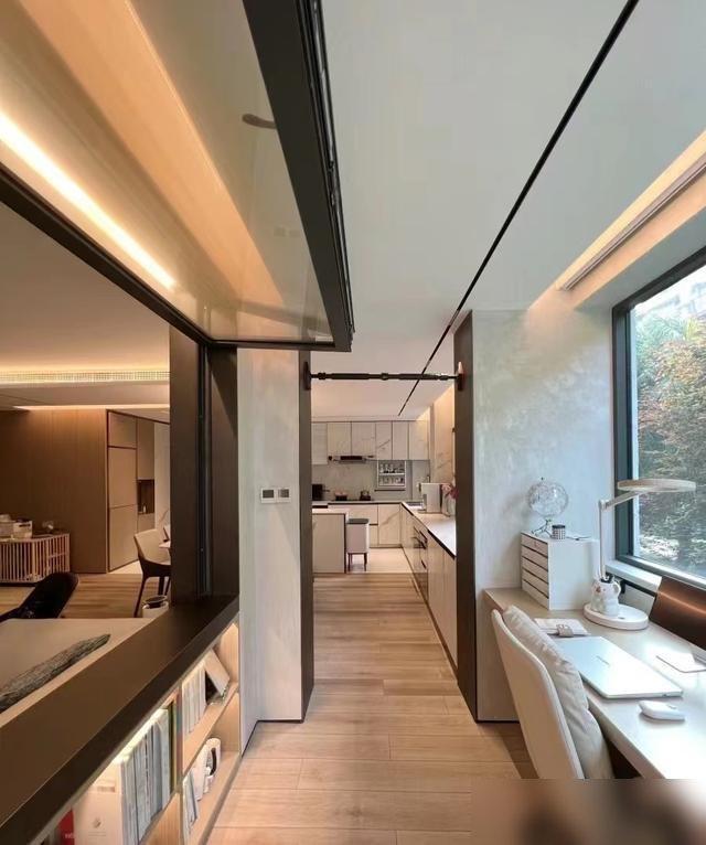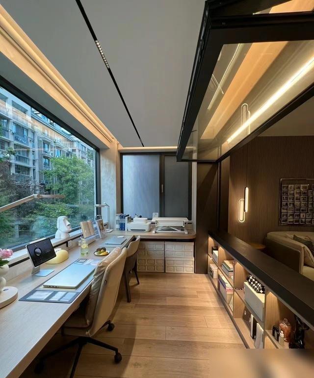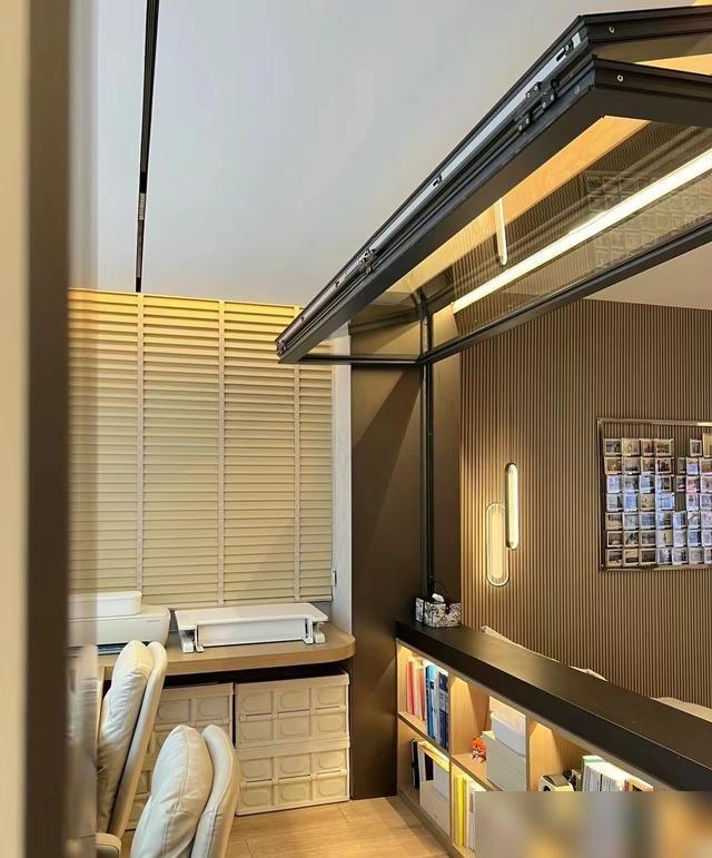 就像那姑娘做的L型懸浮書桌,請朋友來一起辦公都不擠;軟包椅子坐一天腰都不累(懂行的說這叫人體工學,但不用講術語咱也知道——坐得舒服比啥都強);嵌入式燈帶沒有大吊燈壓着,整個空間像被揉進棉花裏,連桌面都乾乾淨淨——這些細節哪裏是"不實用"?