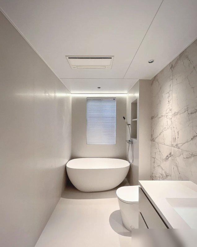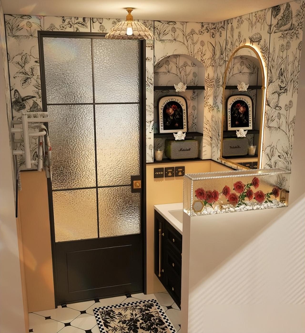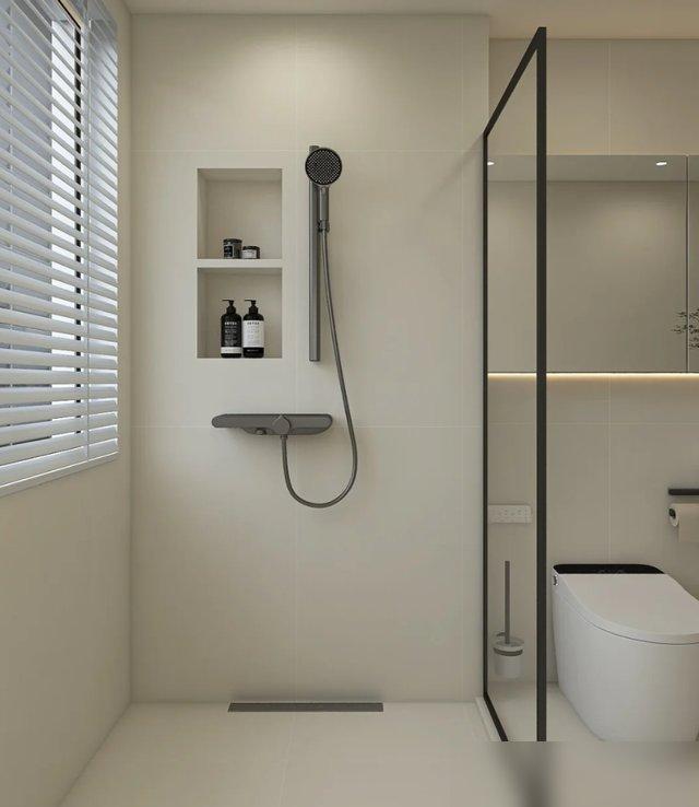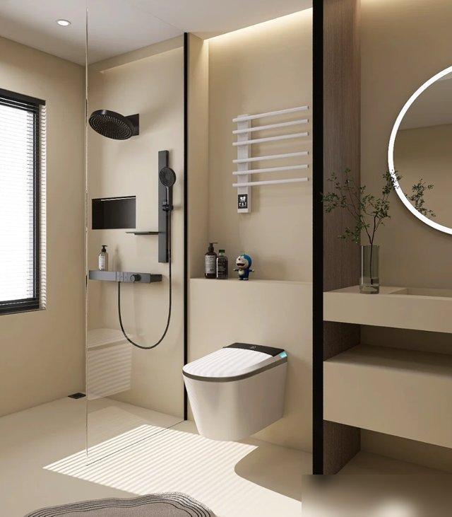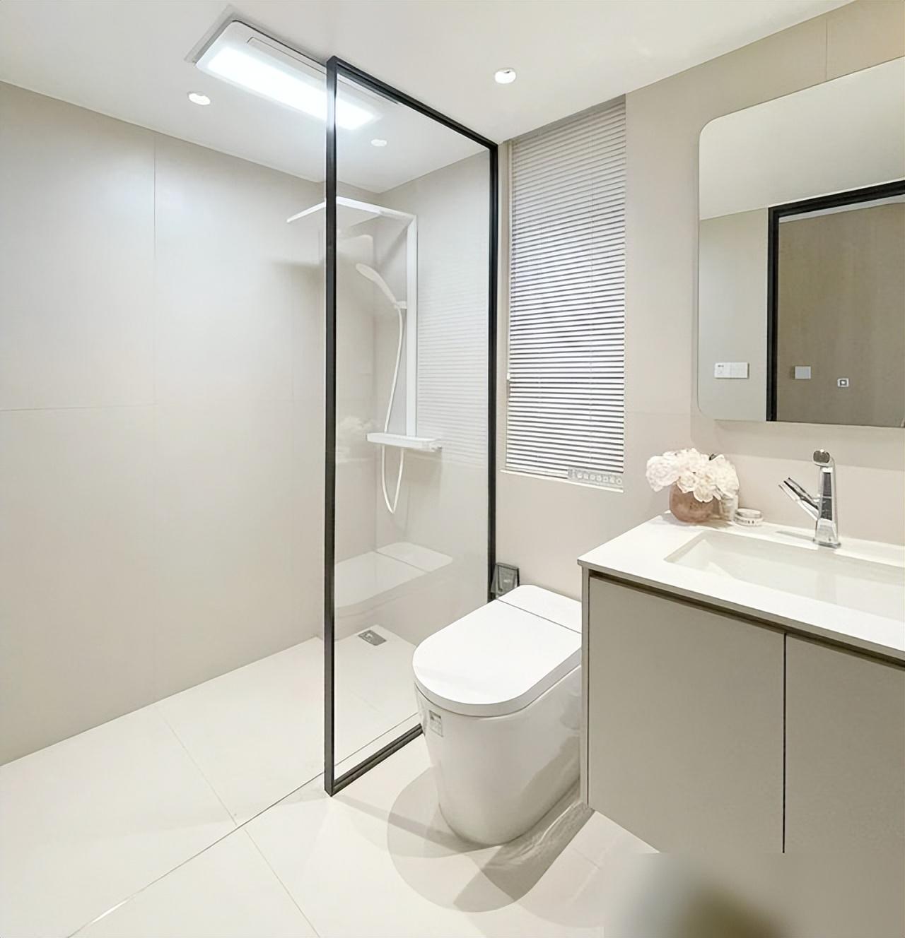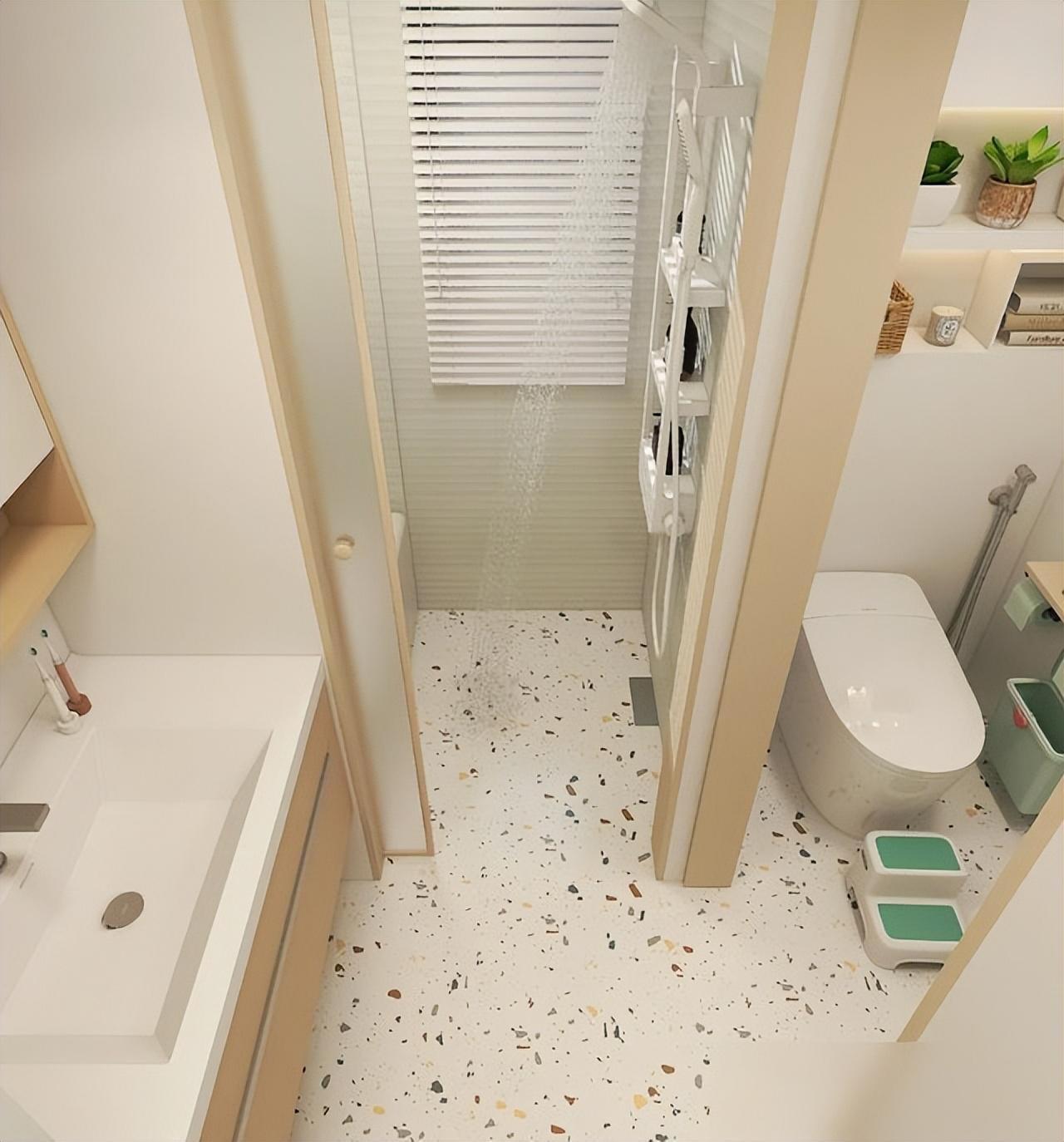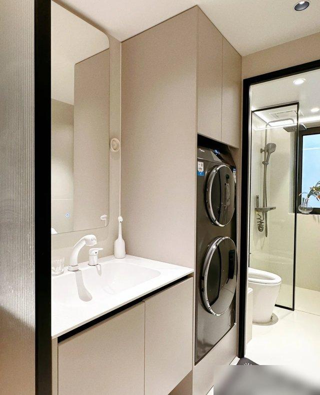 閨蜜家是老破小的縱向衛生間,進門只有1米寬的過道,人家直接把臺盆“搬”到了走廊——做了個超薄的懸空櫃,下面留空放拖鞋,上面配智能鏡帶補光,早上閨蜜在外面塗防曬霜,她老公在裏面上廁所,孩子擠在旁邊刷牙齒,三個人居然能“各幹各的”不打架!你說這招是不是把“空間利用率”玩明白了?還有另一個朋友家的方形衛生間,2.2米見方,隔出了洗漱區、馬桶間、淋浴間加個小收納櫃,連洗衣機都塞進去了,髒衣服直接丟裏面,不用再抱着穿過客廳,這不比死磕“乾溼分離”實用10倍?