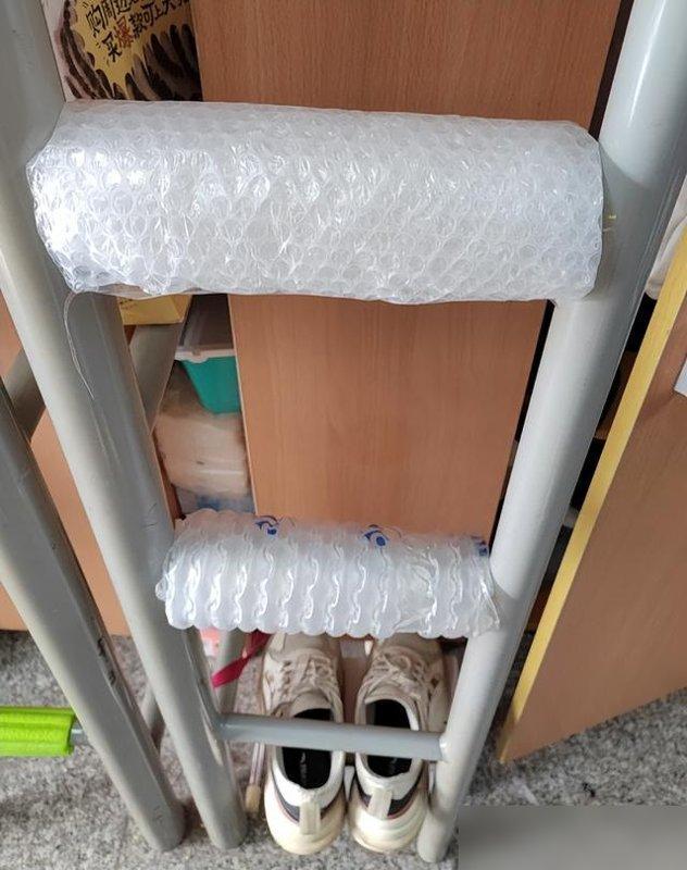 現在我家的氣泡墊快成“全家寶”了:我媽把它鋪在冰箱層架上,放蘋果再也不會碰出坑,上次買的草莓放了三天都沒壞;我那個壓了半年的帆布包,塞點氣泡墊進去,第二天就支棱起來,比買的包撐還軟和;我弟住校,我媽剪了幾塊氣泡墊粘在他宿舍樓梯臺階上,說“爬上鋪不硌腳”——我弟拍視頻給我看,宿舍同學圍在樓梯前問:“這墊在哪買的?軟乎乎的!”他特驕傲:“我媽用快遞泡沫做的!”