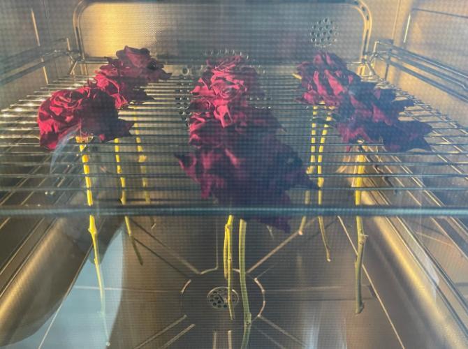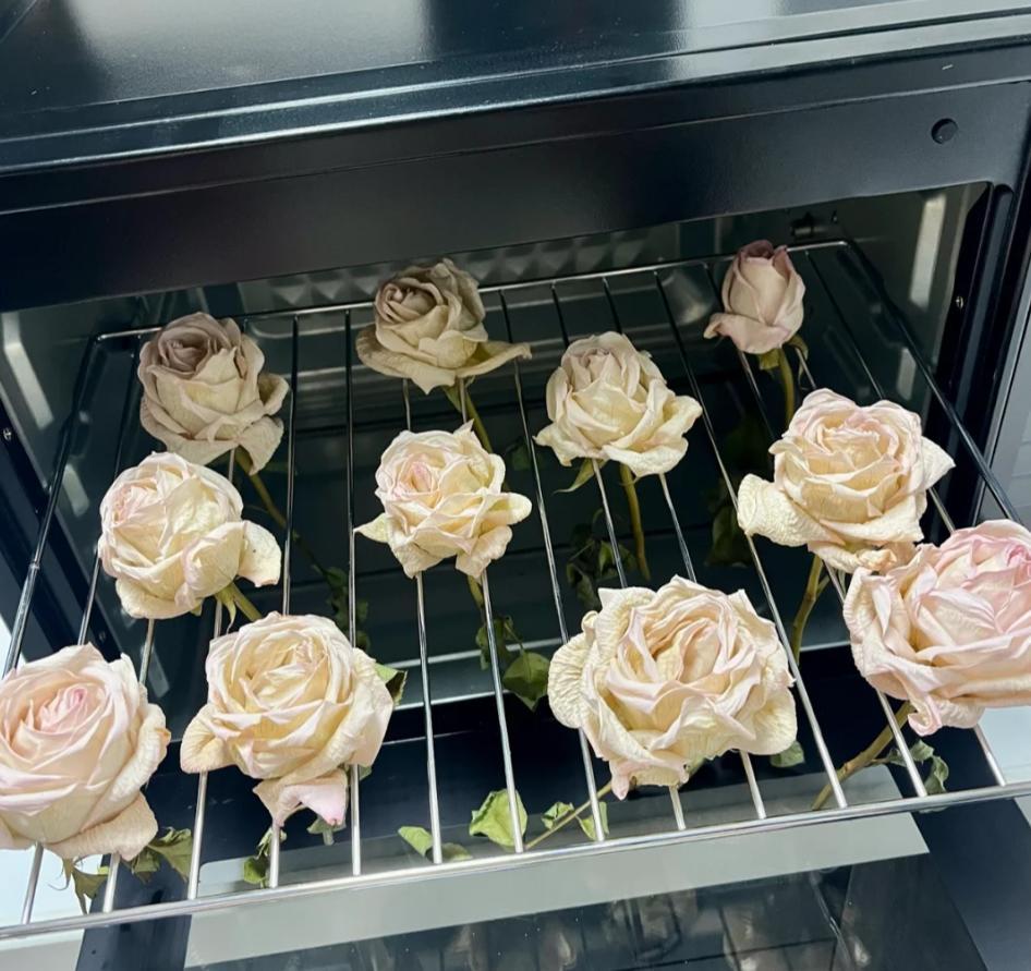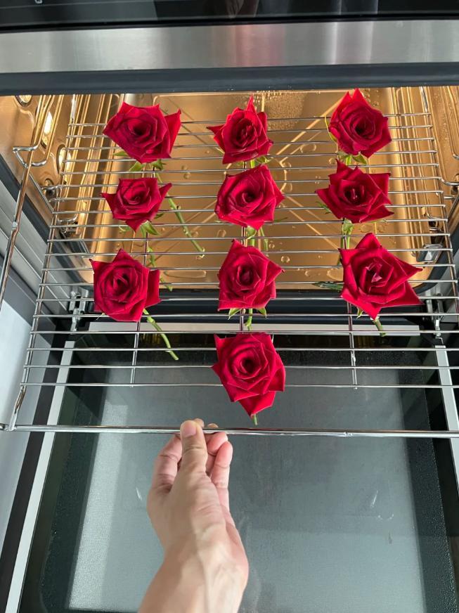 3.程序結束後,倒掛晾一天(也可以繼續用烤箱餘溫20-30分鐘),玫瑰花的花瓣就不會軟塌塌了,這個時候建議直接用玻璃罐等一些容器直接密封起來裝飾。