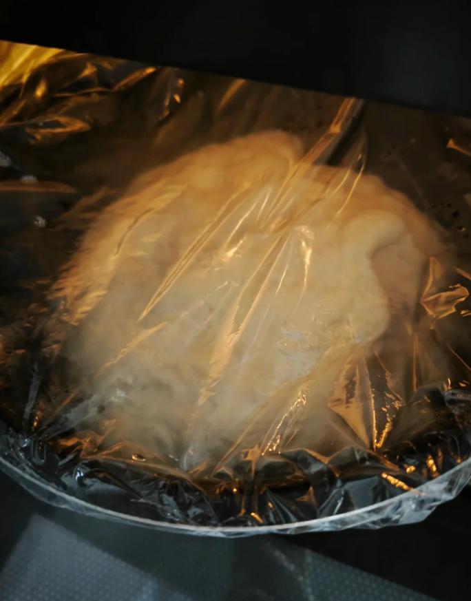 1.把麪糰上灑點水,封上保鮮膜,在保鮮膜上用牙籤戳幾個洞,或者留點縫;