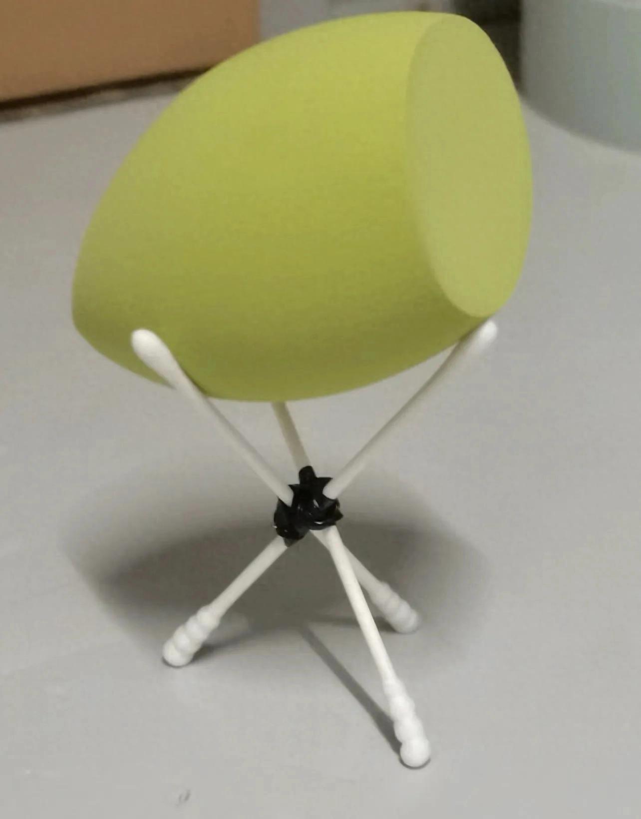 三根棉籤圍成三角+兩根一次性皮筋固定=美妝蛋支架。別說,這小東西還挺別緻!