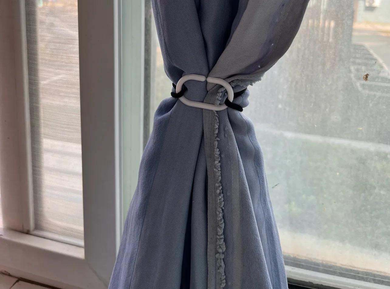 把皮筋皮筋從窗簾掛鉤的開口處穿過,利用皮筋的彈性繞一圈再塞回環內,就是一個環環相扣的窗簾束帶啦!