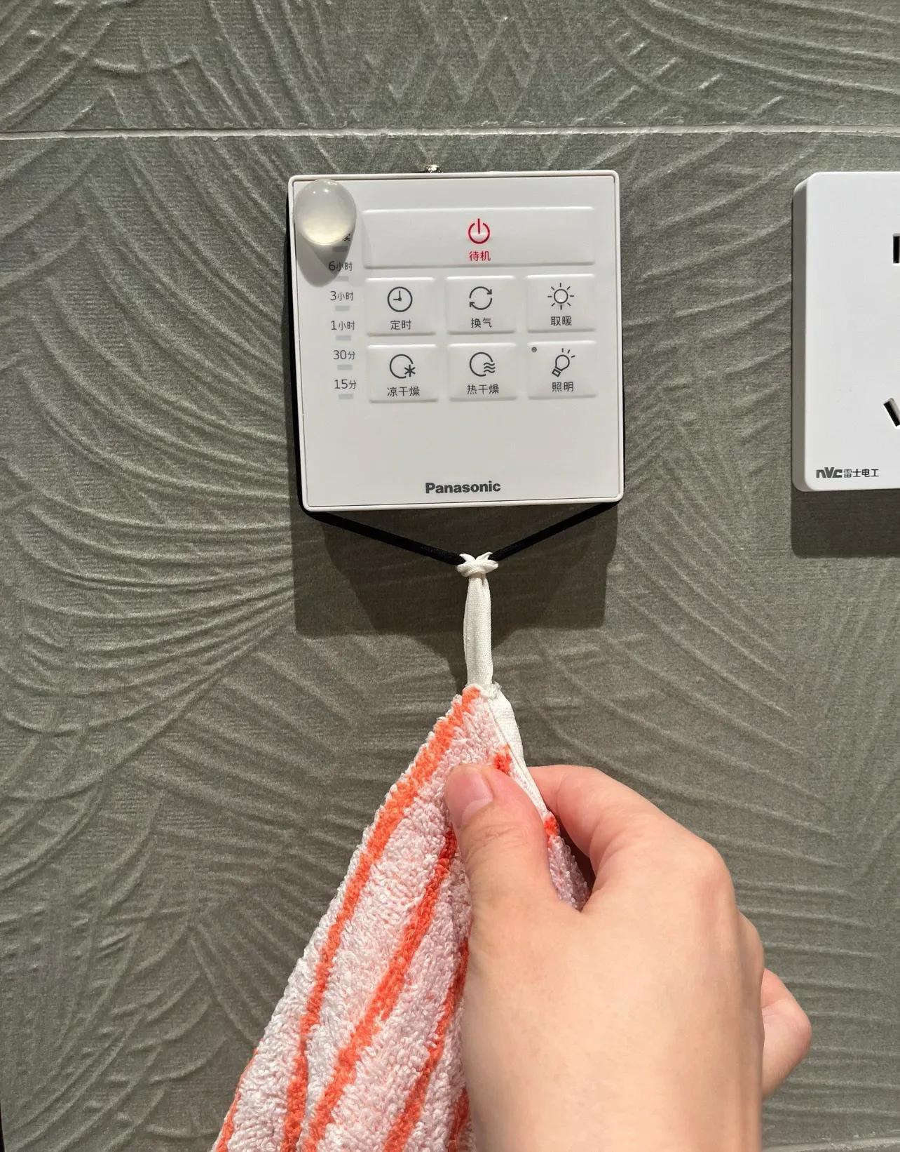 把毛巾自帶的水洗標和一根皮筋綁在一起,再把皮筋掛在開關上就可以了。