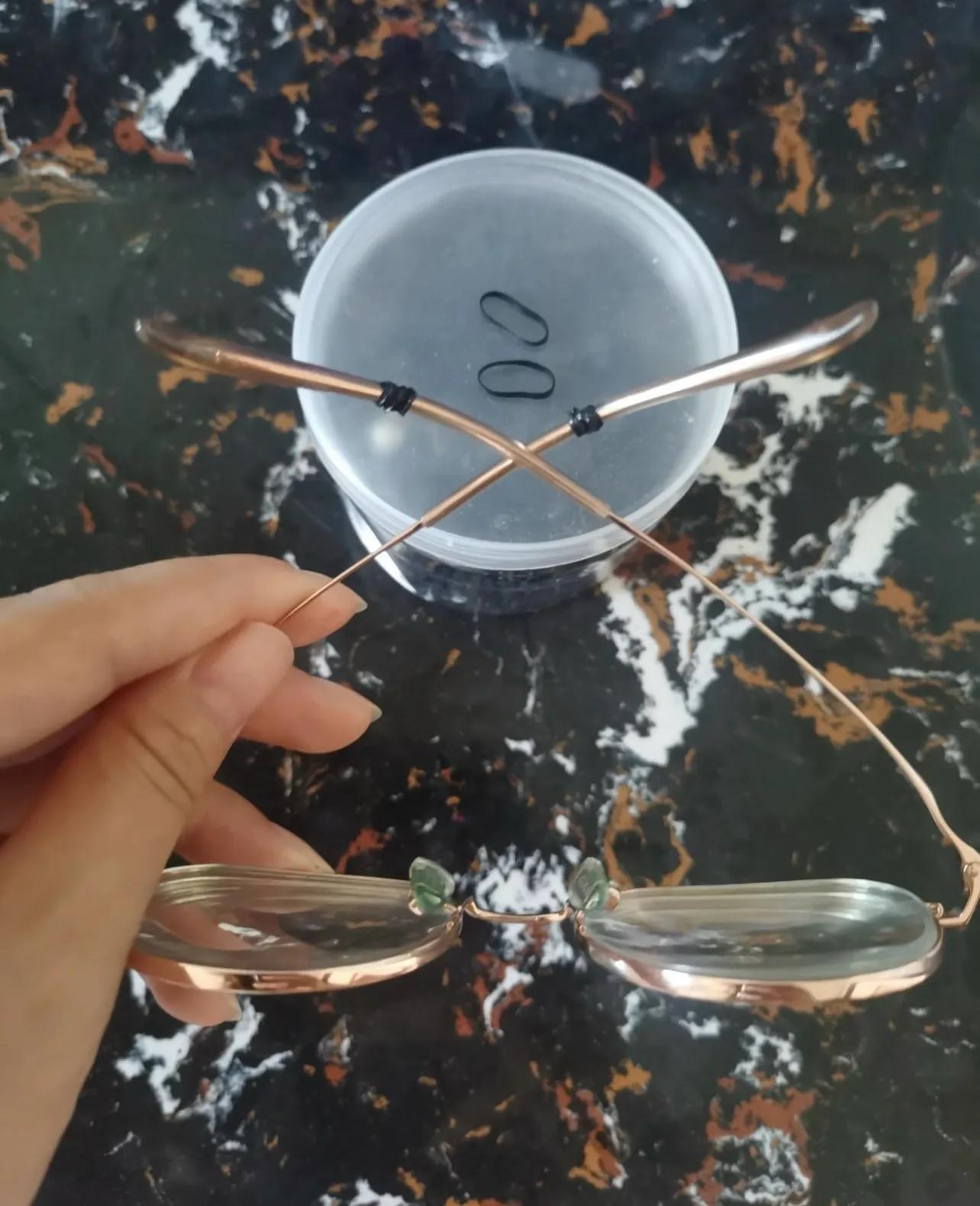 說起來也真是太簡單了,只需要把兩根一次性小皮筋,根據自己的耳廓後方位置分別纏在鏡腿上,使其卡住。摩擦力增大了,眼鏡就真的不掉了!