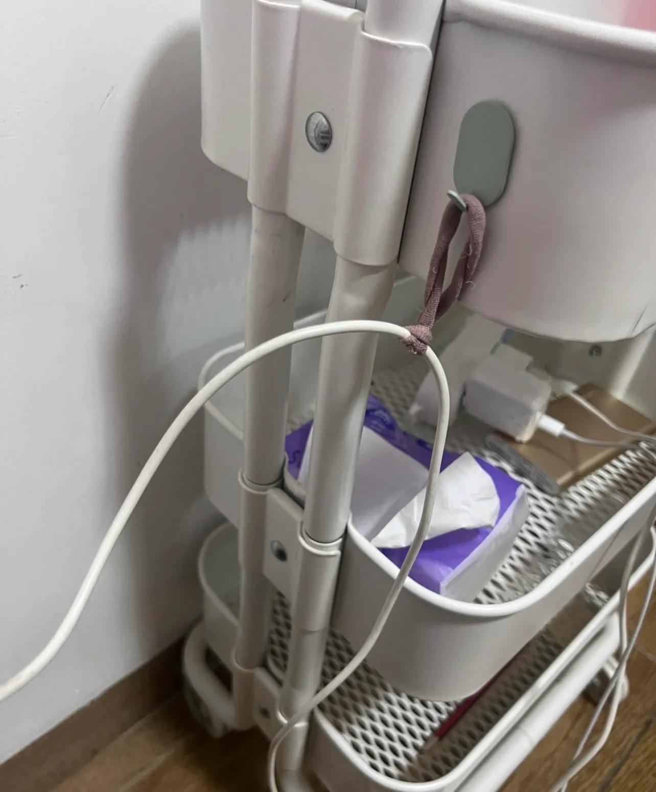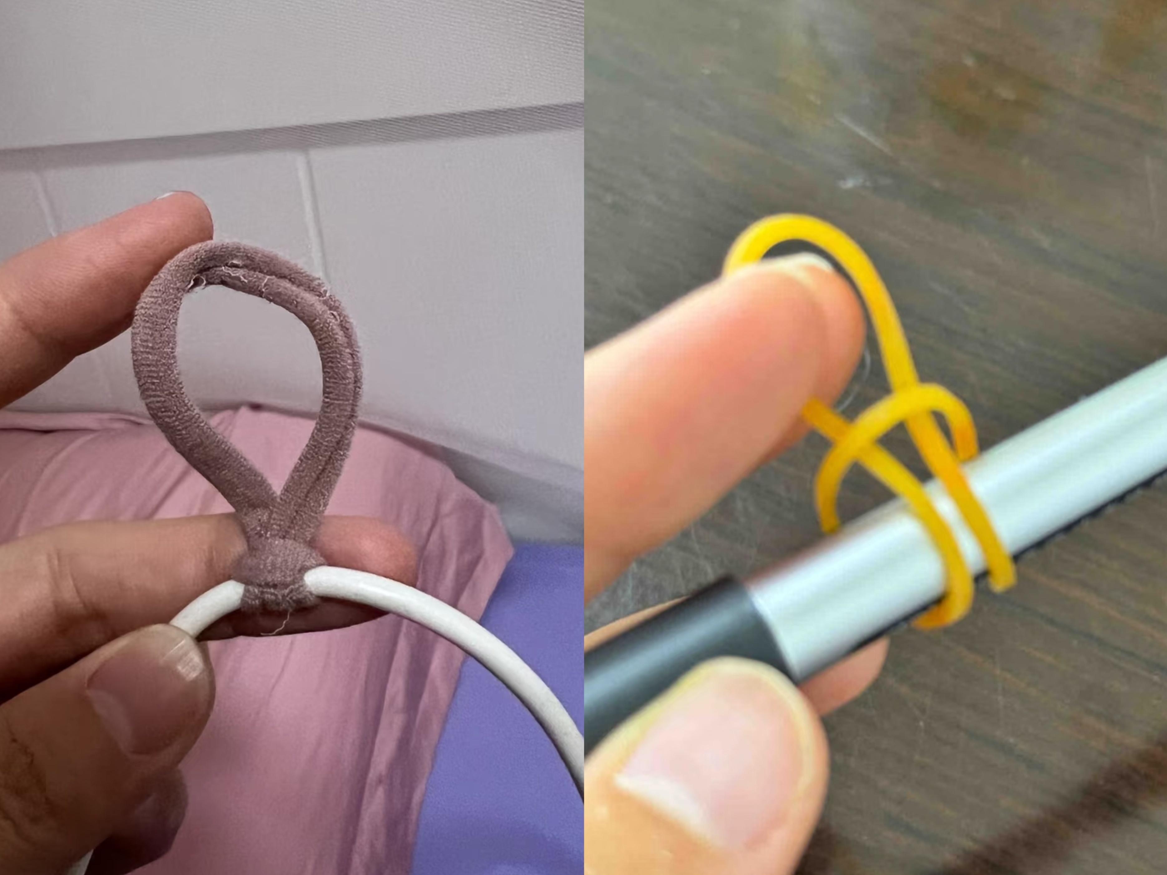 正愁找不到好辦法收拾在地上的數據線,差點就要下單買束線器了,結果就讓我刷到這個神仙辦法,一條橡皮筋,搞定!太好了不用花錢了!