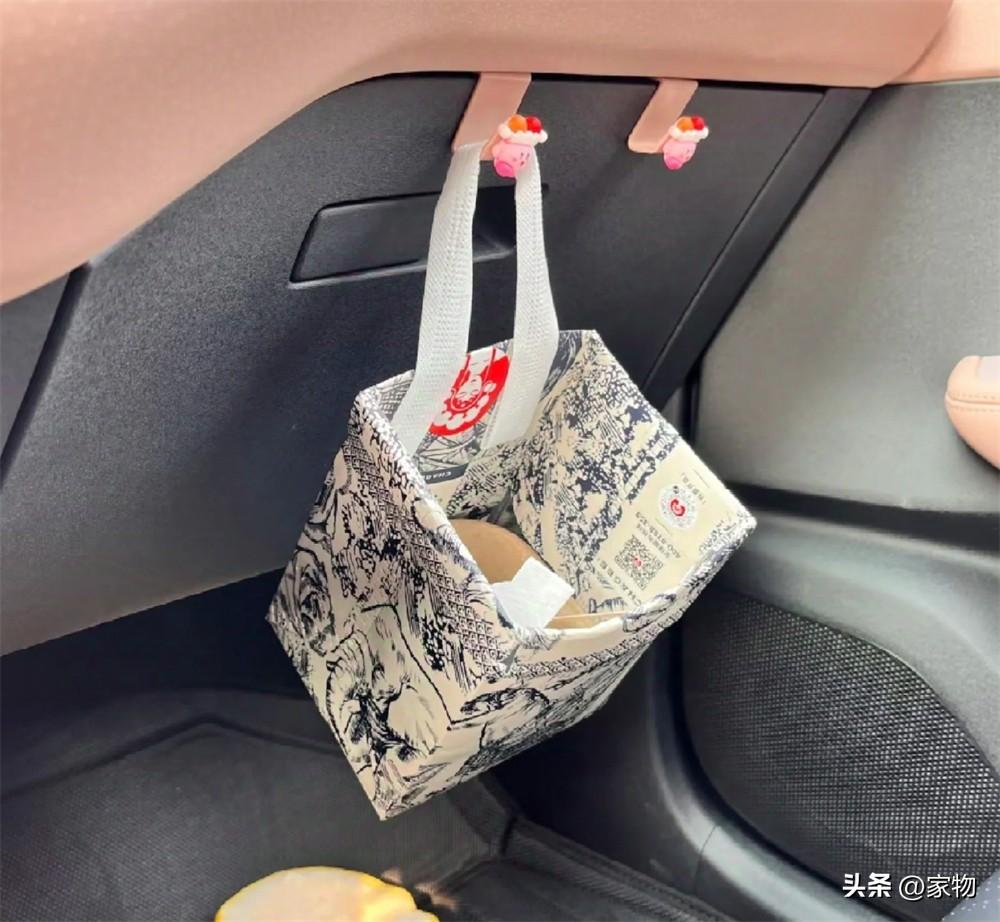 本身就帶提手,袋子也足夠結實,只需要簡單把袋口翻過來固定一下,就能秒變一個車載垃圾桶,後排喫個瓜子零食什麼的,真的很方便。