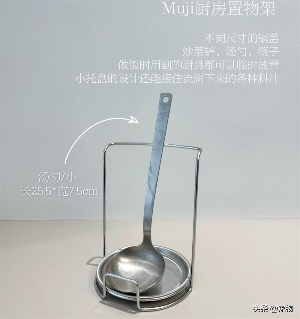 最後就是這種廚房置物架啦,也同樣是小身材大用途,不同尺寸的鍋蓋、炒菜鏟、湯勺以及其他的餐具廚具都可以用它臨時收納放置,避免菜湯或者油污弄髒桌面,底部的接水盤更是可以拿下來單獨清洗,好用得很!