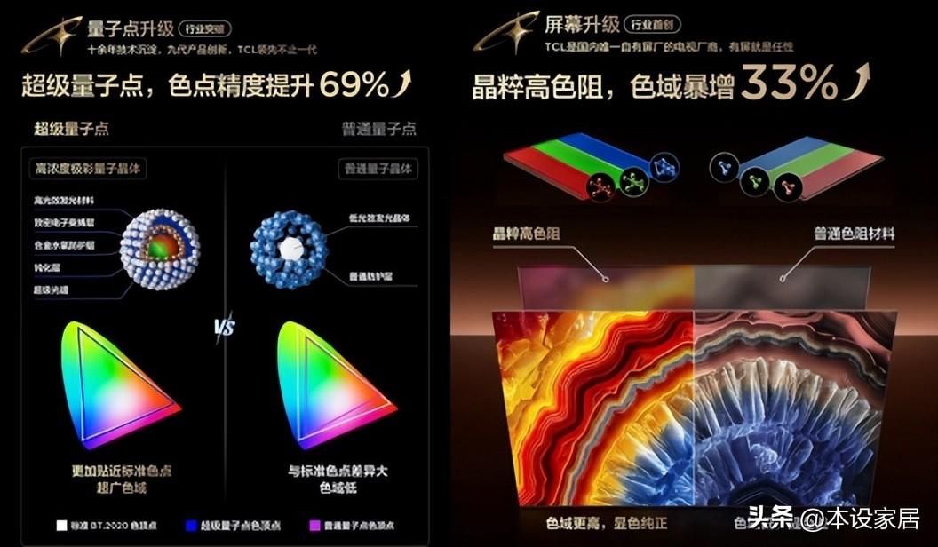 SQD-Mini LED技術之所以可以實現這個歷史性的突破,關鍵在於兩大“超級”必殺技。第一個必殺技,超級量子點,將核心材料升級爲高濃度極彩量子晶體,如同一臺“色彩高精度發動機”,能從光源層面激發出純度極高的紅、綠、藍三原色光,從根源上確保了色彩的純度。緊接着,發揮了大作用的第二個必殺技,則是其搭載的超級蝶翼華曜屏,新增了晶粹高色阻技術,如同“色彩濾網”角色,在輸出前再一次過濾掉雜光,只釋放最爲純淨的光,色域自然得到進一步的提升。