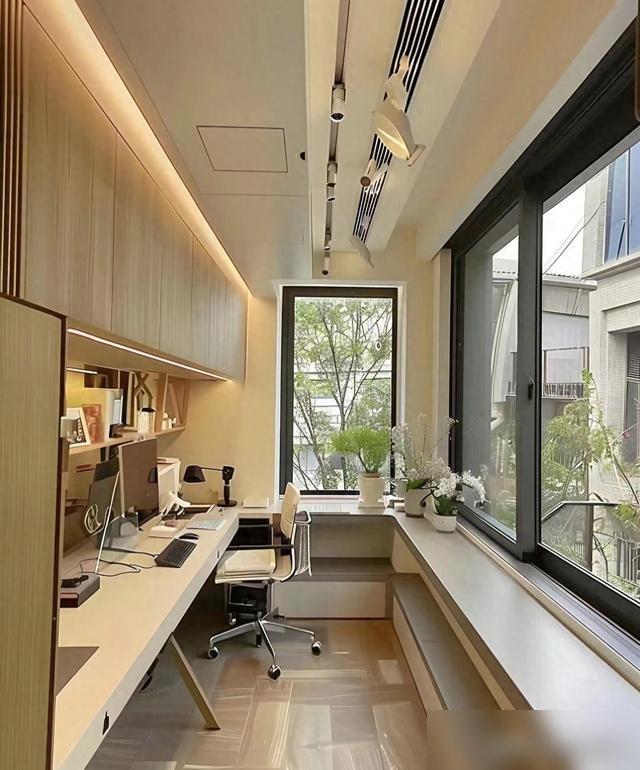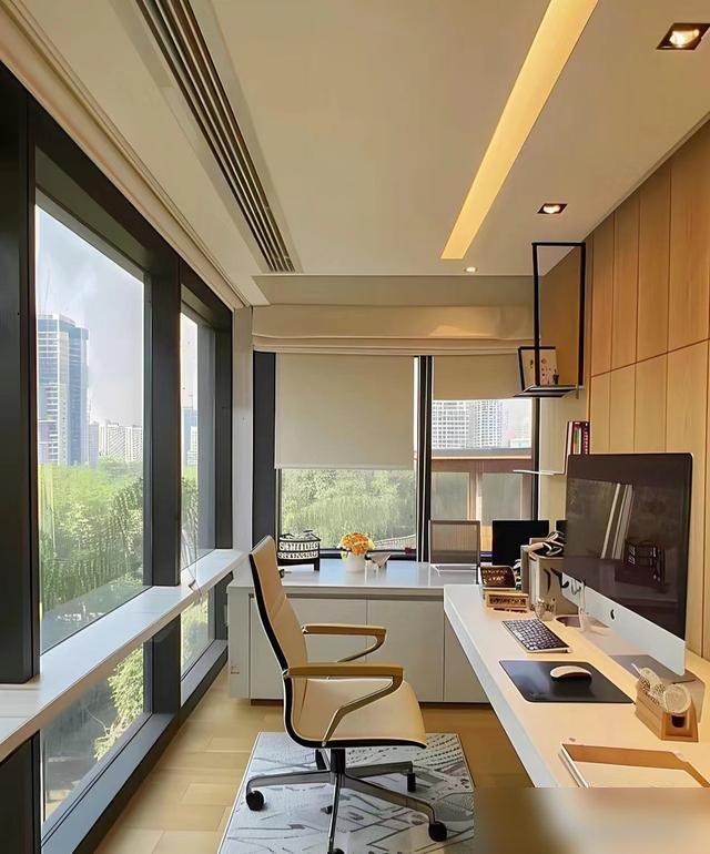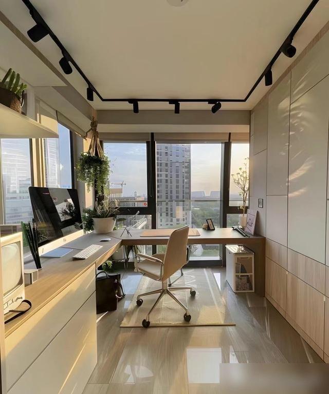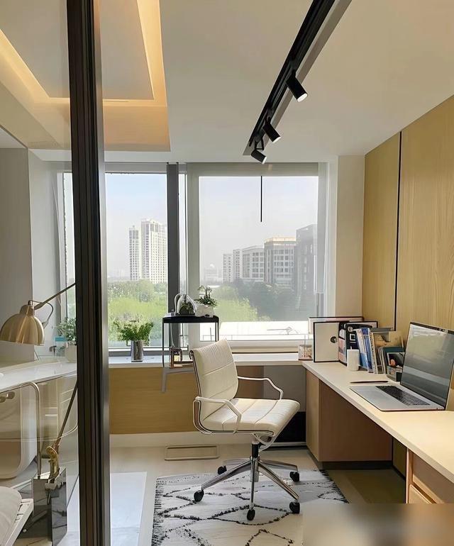 最絕的是L型書桌——不是那種窄得只能放鍵盤的小桌子,是能同時擺開電腦、翻開的書、一杯熱奶茶,甚至放盆小多肉的“全能選手”。你坐這兒寫方案,抬頭能看見天上的雲慢慢飄;改稿改到煩躁,轉頭看窗外的樹搖葉子,比刷手機緩解焦慮管用一百倍。傍晚夕陽斜進來,原木桌泛着暖光,連鍵盤都像裹了層糖,這時候哪怕就翻兩頁閒書,都覺得“今天沒白活”。