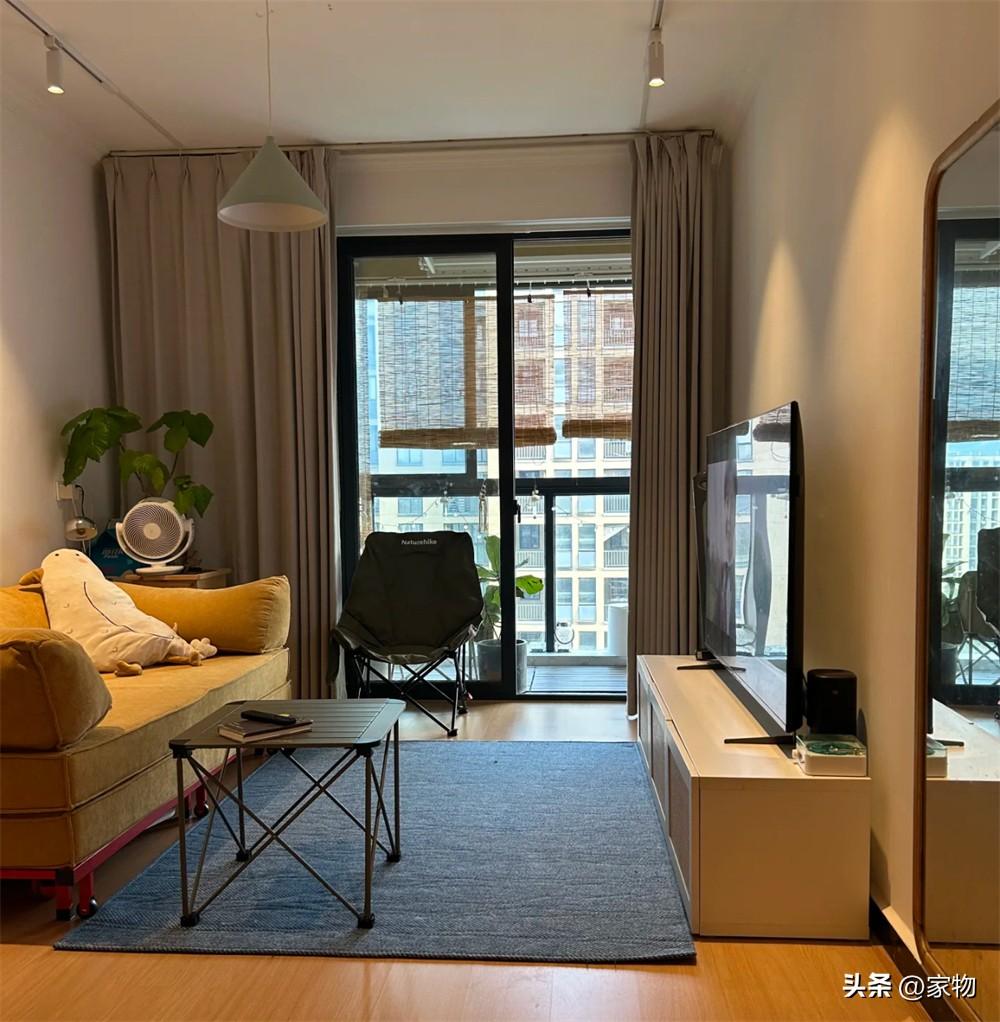 爲了方便日常清潔打掃,客廳裏的陳設非常簡單,一張長沙發、一個可以摺疊的露營桌(代替茶几),再加上一組不放亂七八糟物品的電視櫃,實現了觀影休閒追劇放鬆等一系列功能。