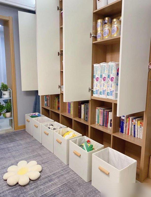 客廳做了整面32cm深的櫃子,底層塞無紡布收納筐,孩子翻完的積木、小汽車往筐裏一丟,一分鐘就能恢復原樣——這不比蹲在地上撿半小時玩具強?