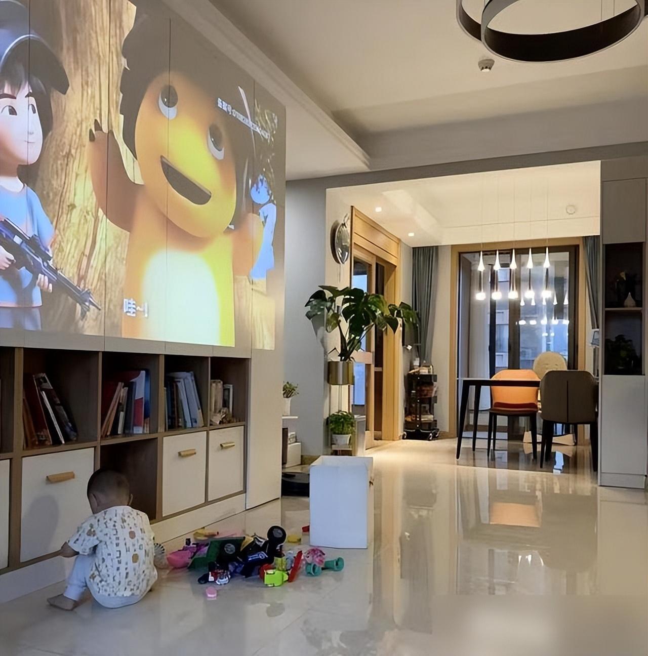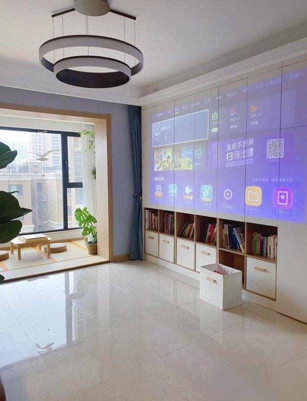 更聰明的是留了層開放格放當下讀的書,孩子路過就想翻兩頁,親子閱讀不用催着喊着;客廳沒裝電視,但投影儀往邊几上一擺,側投自動矯正,想看電影拉上窗簾就行,比改隱藏幕布省事兒一百倍。