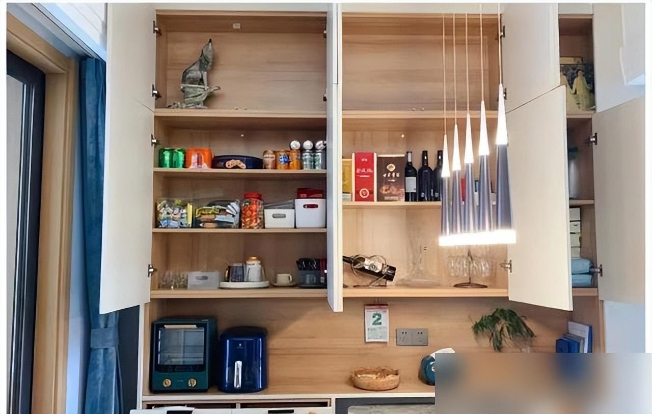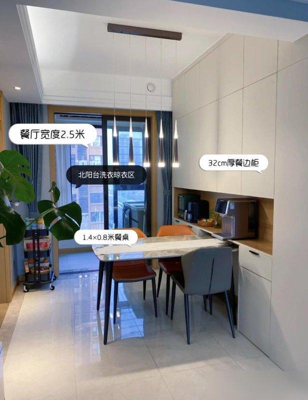 餐廳的細節也藏着小心機:北陽臺用來洗衣,完美保持南北通透;餐邊櫃做32cm厚,餐桌嵌進櫃子一點,三個邊都能走得開,入住兩年還沒塞滿——這收納力誰看了不眼紅?
