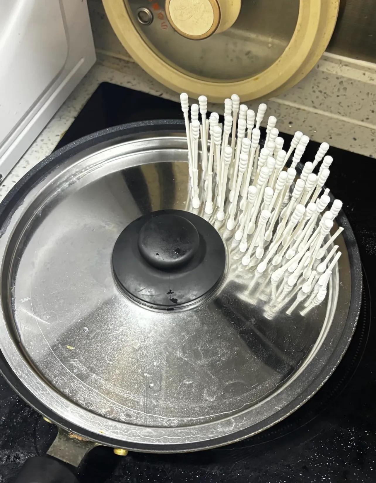 這位朋友涼了一個下午都沒能打開,也不知道哪個出的餿主意,讓堵住氣孔加熱,於是就出現了這麼一堆棉籤,除了造型上的作用,沒有任何作用。