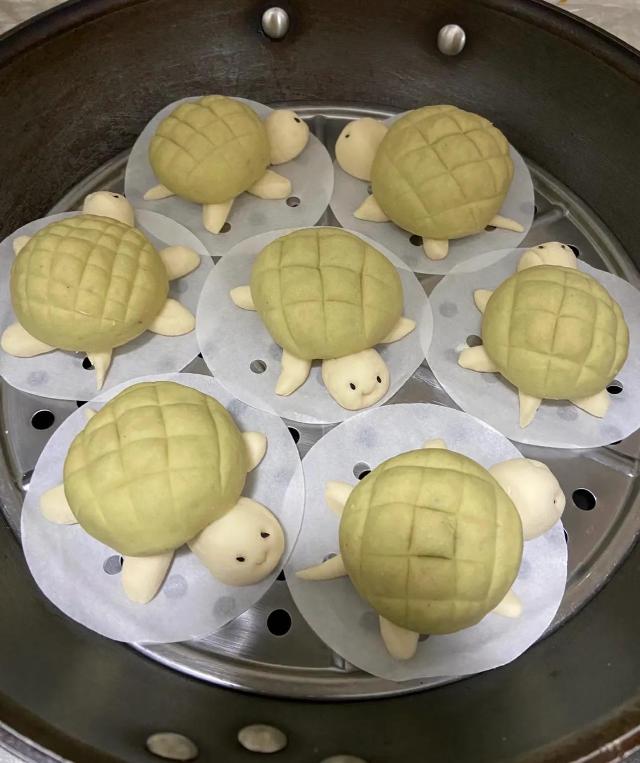 上蒸籠前,我那烏龜造型喜人,龜殼圓潤,小腳勻稱,表情也恰到好處,還給它們留夠了膨脹位置。