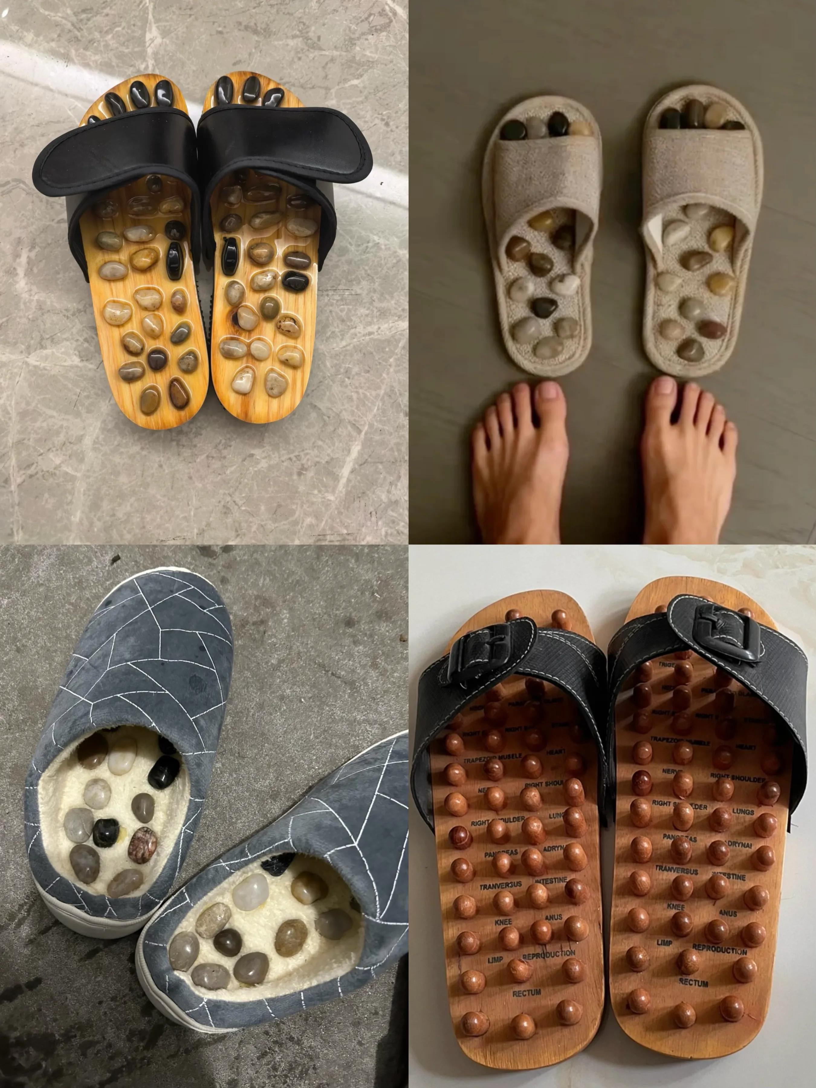 國內廠商哪能放過這個機會,隨後立馬跟進,各種指壓板拖鞋雨後春筍般往外冒,尤其是“天然”鵝卵石的。