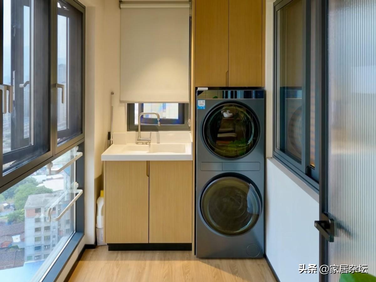 裝修時,把傳統的晾衣陽臺改造成了多功能的功能陽臺。陽臺窗是使用的斷橋鋁系統窗,地面鋪的是瓷磚,牆面做了防水,還安裝了櫃子和洞洞板,預留了上下水和電源,安裝了電動的升降晾衣架。