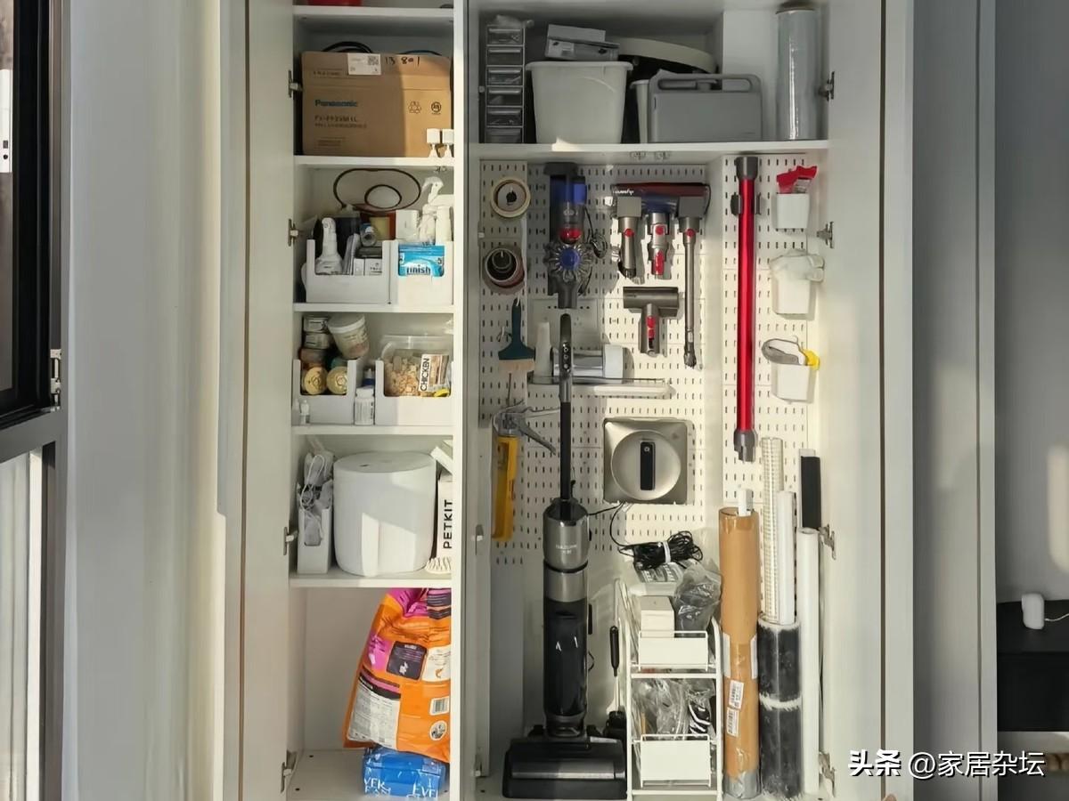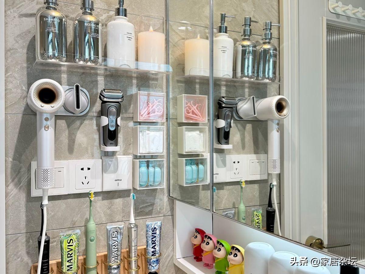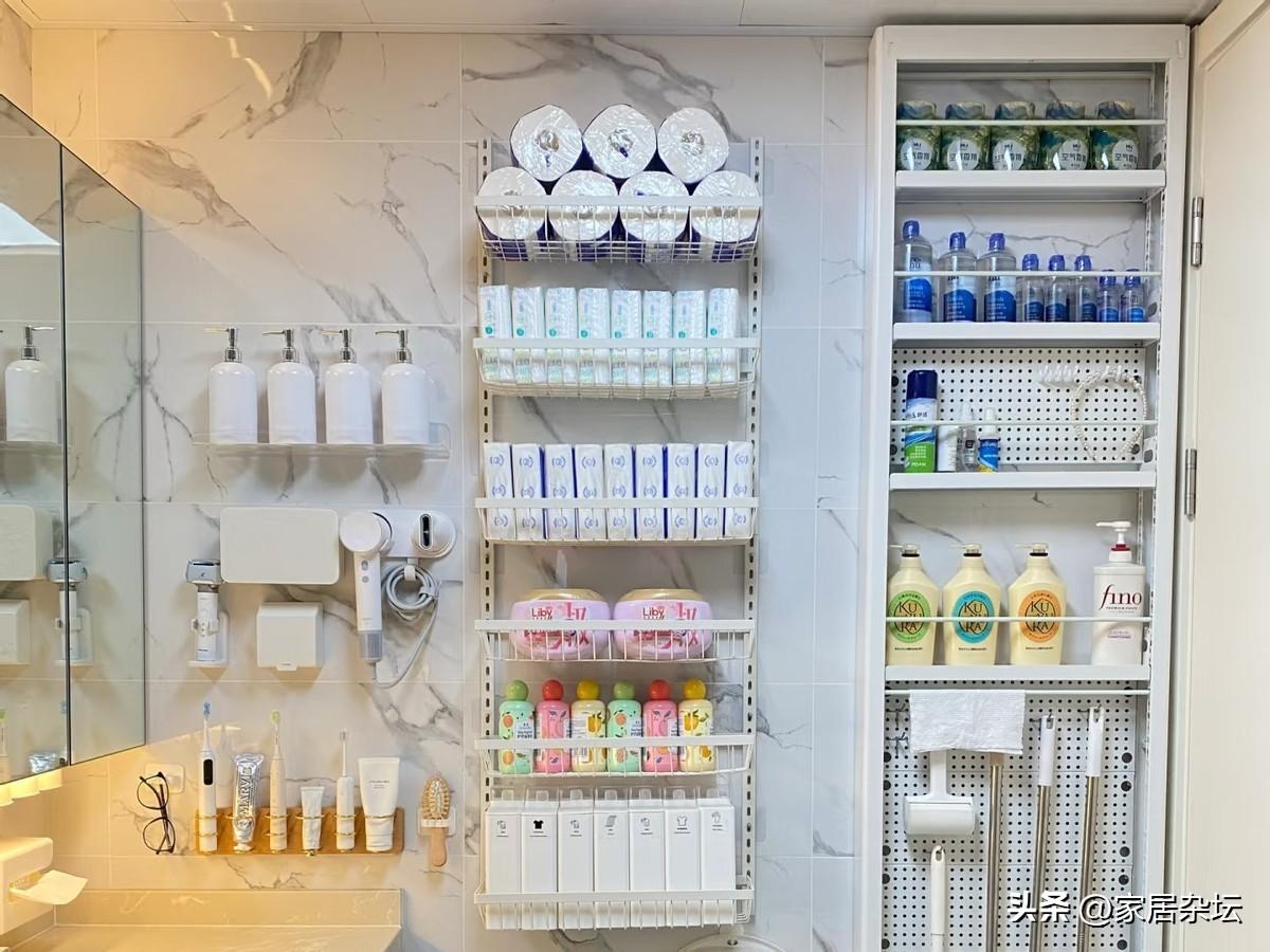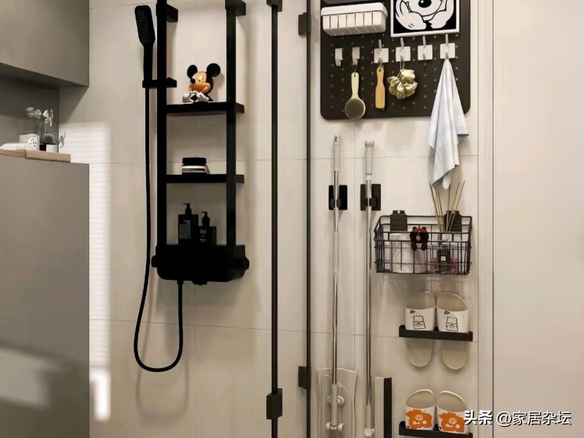 垂直收納,把物品從地面檯面就轉移到了牆上,不僅省地方,而且打掃更方便了。還能讓這些物品很快乾燥,不容易發黴。