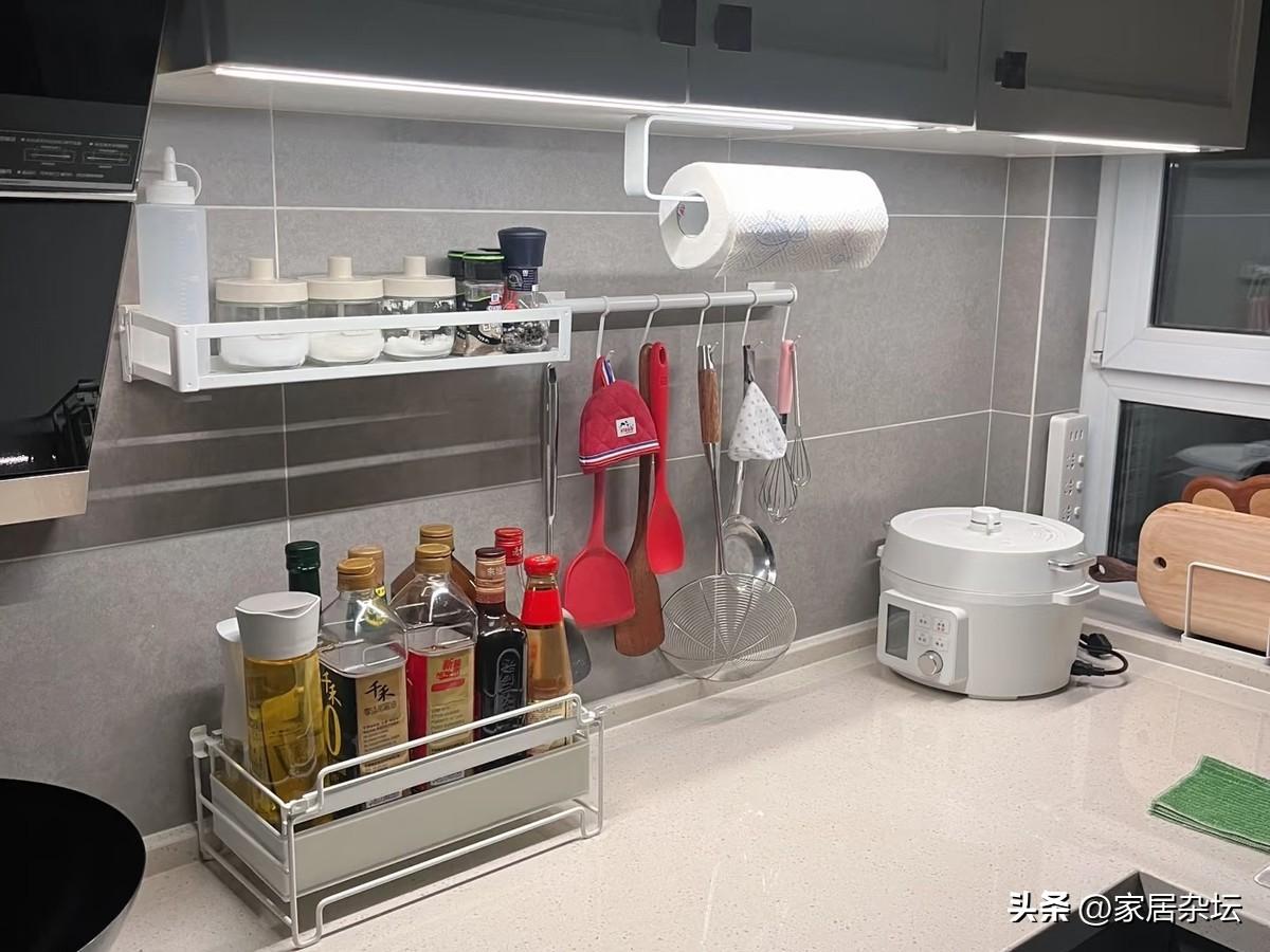 在廚房就買了一塊磁吸的收納架,把廚房的鏟子,湯勺都掛起來了。衛生間用的是粘鉤,把抹布,清潔刷,拖鞋都掛在牆面上。