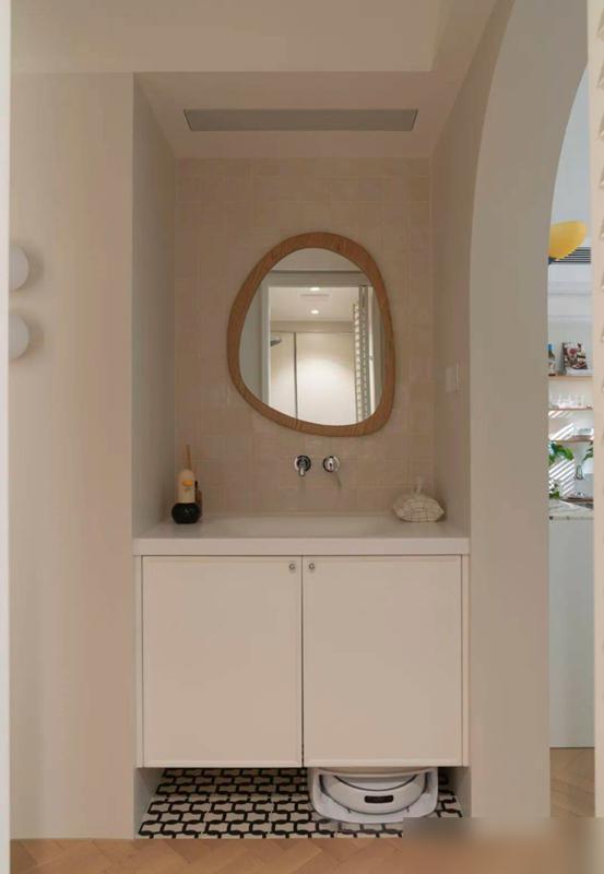 承重柱留着,薄櫃貼着牆“偷”空間,洗手池外移做三分離,玄關塞個洗衣房。