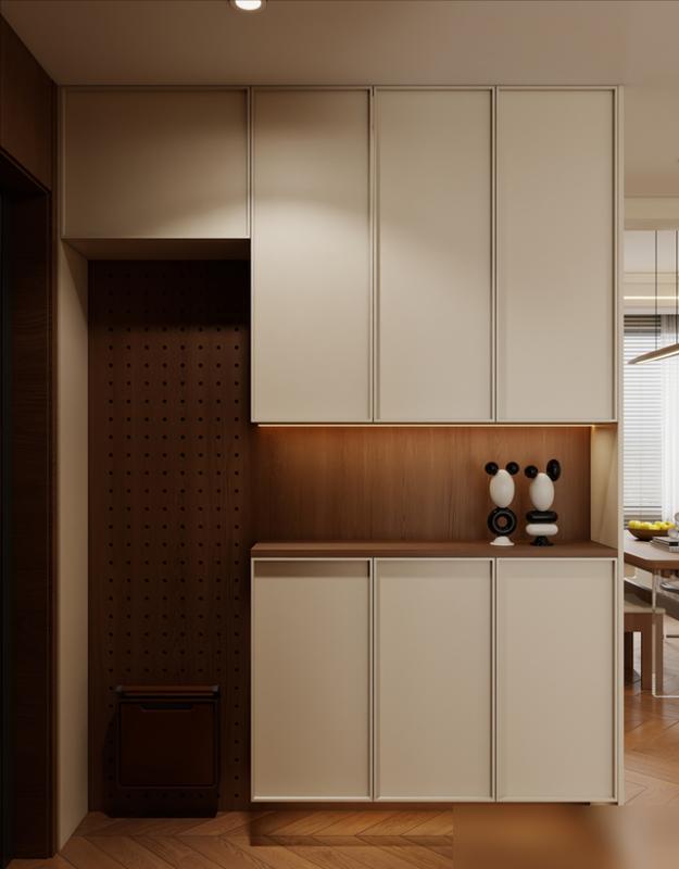 胡桃木櫃體選得精準,顏色穩重耐髒,櫃門一關雜物全藏住,過日子哪能天天收拾得樣板間似的?